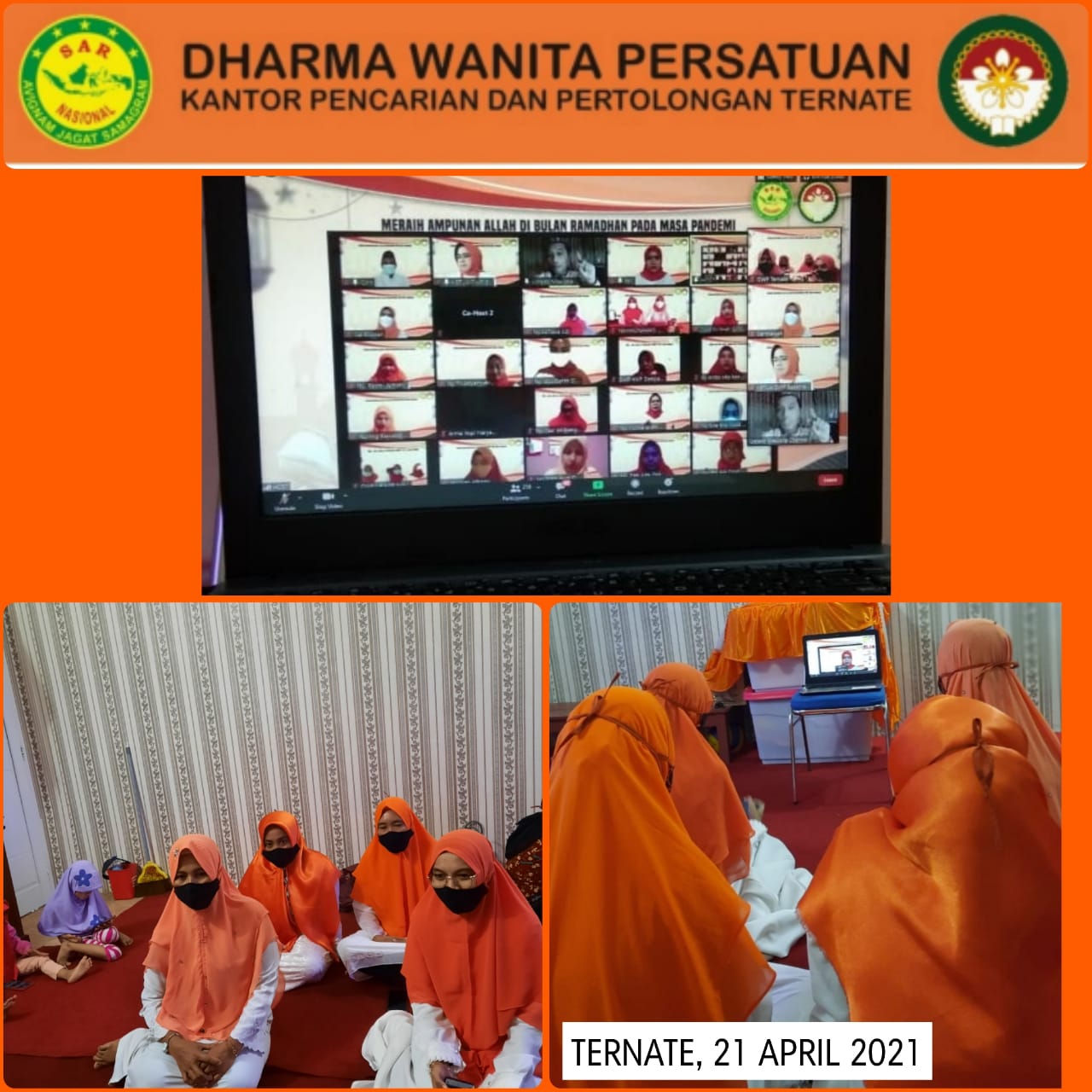 Tanggal 22 April 2021 DWP UP Kantor Pencarian dan Pertolongan Ternate beserta anggota DWP Unit SAR Sanana dan Unit SAR Bacan mengikuti pengajian virtual yang di adakan oleh DWP BASARNAS dengan tema " Meraih Ampunan AIIah di Bulan Ramadhan Pada Masa Pandemi" oleh Ustad Maulana melalui aplikasi zoom meeting.