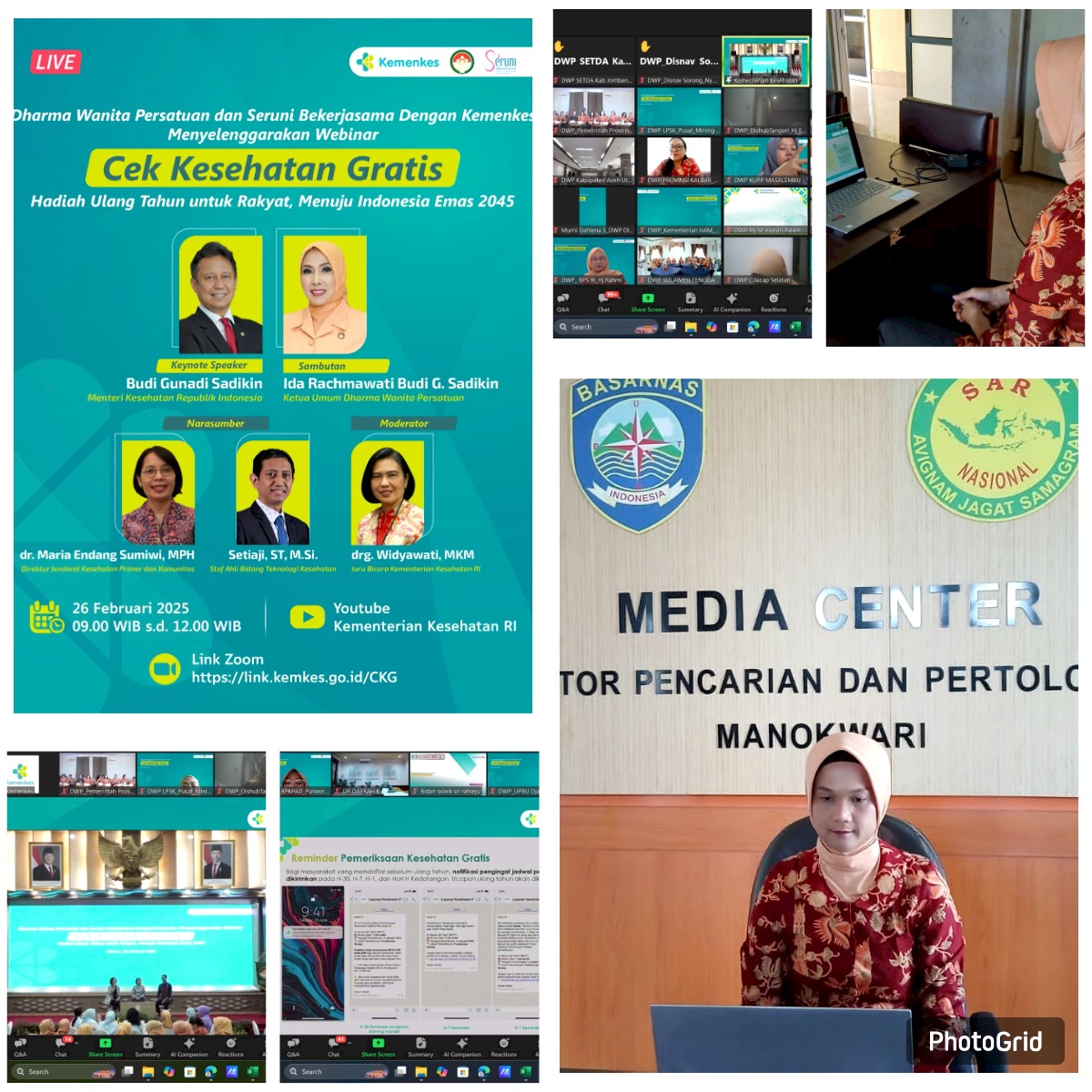 Rabu, 26 Februari 2025 DWP UP KPP Manokwari mengikuti Webinar Sosialisasi Pemeriksaan Kesehatan Gratis (PKG) yang diselenggarakan oleh Dharma Wanita Persatuan Pusat, Seruni Kabinet Merah Putih yang bekerjasama dengan Kementerian Kesehatan RI. Kegiatan luring bertempat di Auditorium G.A Siwabessy Gedung Sujudi Kementeriaan Kesehatan dan daring melalui aplikasi zoom meeting.