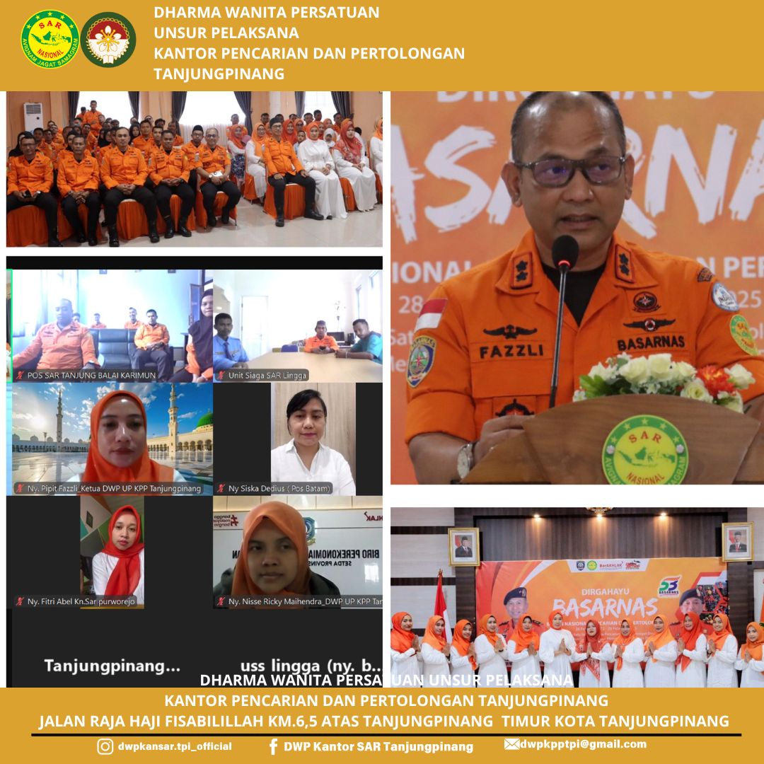Jumat, 28 Februari 2025, Ketua Dharma Wanita Persatuan Unsur Pelaksana Kantor Pencarian Dan Pertolongan Tanjungpinang Ny. Pipit Fazzli Mengikuti Tasyakuran HUT Basarnas Ke-53 Tahun Secara Daring, Kegiatan ini juga dihadiri Pengurus dan Anggota Dharma Wanita Persatuan Unsur Pelaksana Kantor Pencarian dan Pertolongan Tanjungpinang secara daring dan tatap muka di Aula Lantai II Kantor Pencarian dan Pertolongan Tanjungpinang.