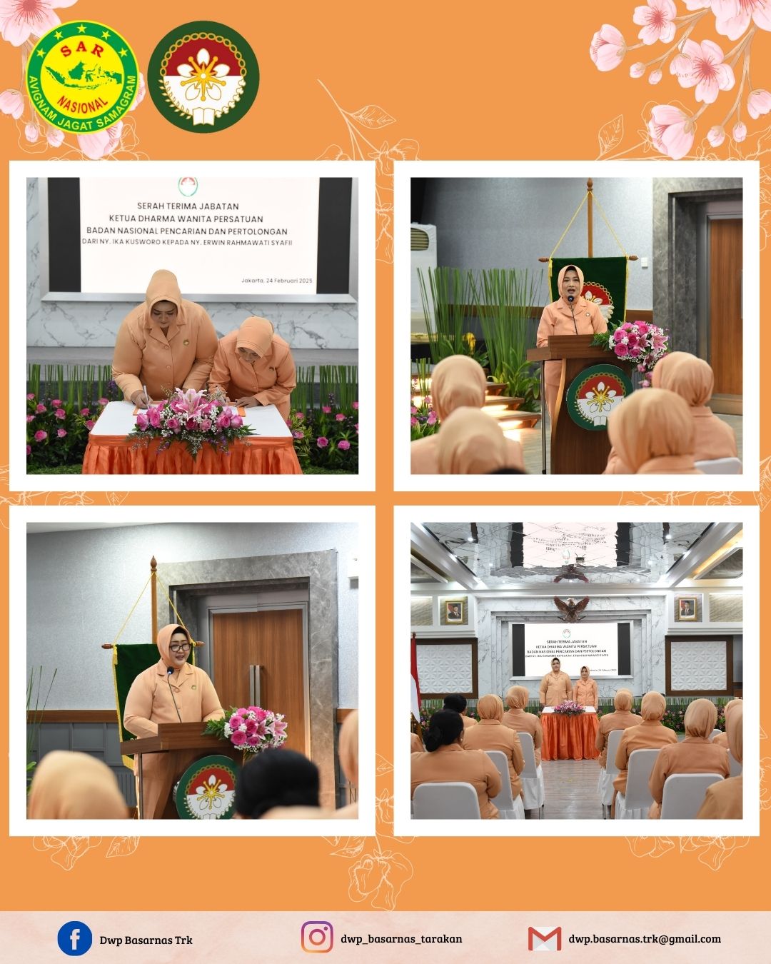 Senin, 24 Februari 2025 Ketua Dharma Wanita Persatuan Unsur Pelaksana Kantor Pencarian dan Pertolongan Tarakan, Ny. Gita Syahril mengikuti kegiatan Serah Terima Jabatan Ketua Dharma Wanita Persatuan Badan Nasional Pencarian dan Pertolongan dari Ny. Ika Kusworo Kepada Ny. Erwin Rahmawati Syafii, yang bertempat di Lantai 2 Gedung Basarnas Jakarta.