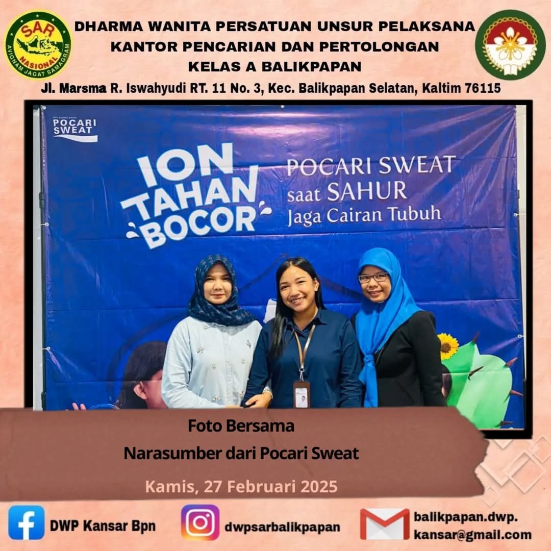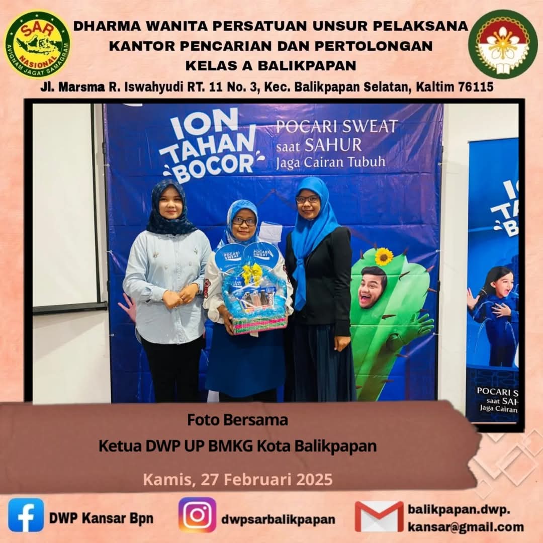 Kamis, 27 Februari 2025 DWP UP Kantor Pencarian dan Pertolongan Kelas A Balikpapan yang diwakili Ny. Neti Anton dan Ny. Febriyani Nur Ngalim mengikuti kegiatan Ramadhan Mom's Education bersama DWP UP BMKG dan Pocari Sweat