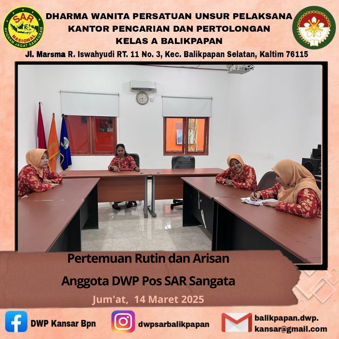 Jumat, 14 Maret 2025 DWP UP Kantor Pencarian dan Pertolongan Kelas A Balikpapan Pos Pencarian dan Pertolongan Sangatta mengadakan pertemuan rutin anggota dan arisan