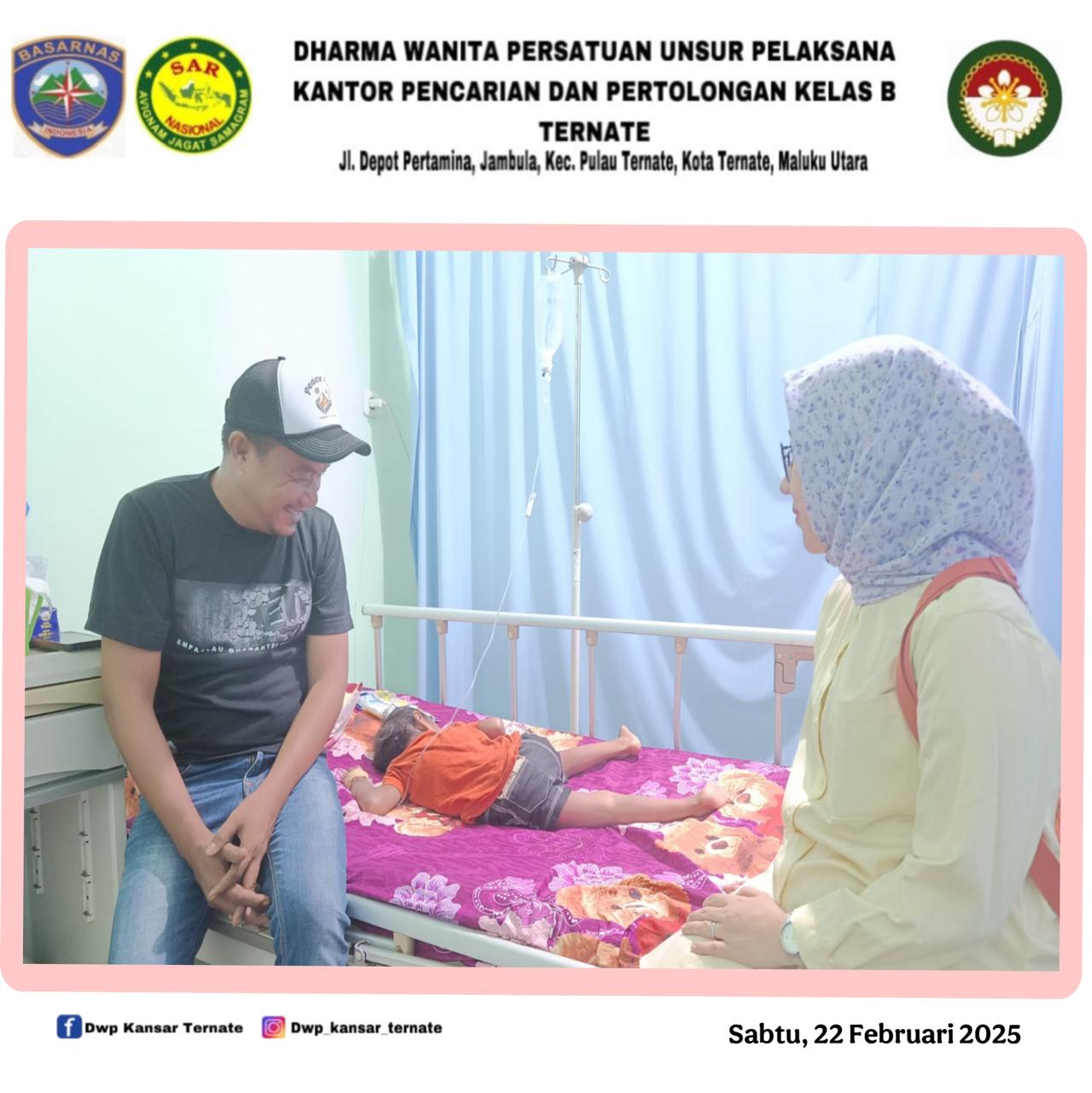 Sabtu, 22 Februari 2025 Dharma Wanita Persatuan Unsur Pelaksana Kantor Pencarian dan Pertolongan Ternate yang diwakilkan oleh Ny. Carry Bram menjenguk ananda tercinta , anak dari salah satu anggota Dharma Wanita Persatuan Unsur Pelaksana Kantor Pencarian dan Pertolongan Ternate Ny. Rudin yang sedang di rawat di Rumah Sakit