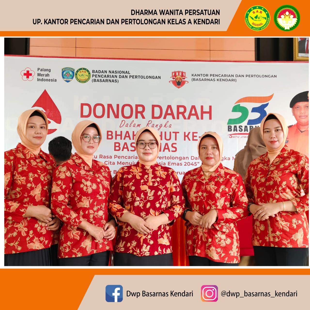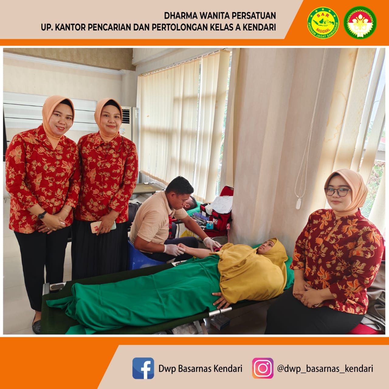 DWP UP Kantor Pencarian dan Pertolongan Kendari turut berpartisipasi Giat Donor Darah Dalam Rangka Hari Bhakti HUT Ke 53 BASARNAS. Beberapa instansi potensi SAR turut hadir dalam Kegiatan donor darah. Kegiatan ini di laksanakan di Aula Pertemuan Kantor Basarnas Kendari Kerjasama dengan Palang Merah Indonesia, Provinsi Sulawesi Tenggara.