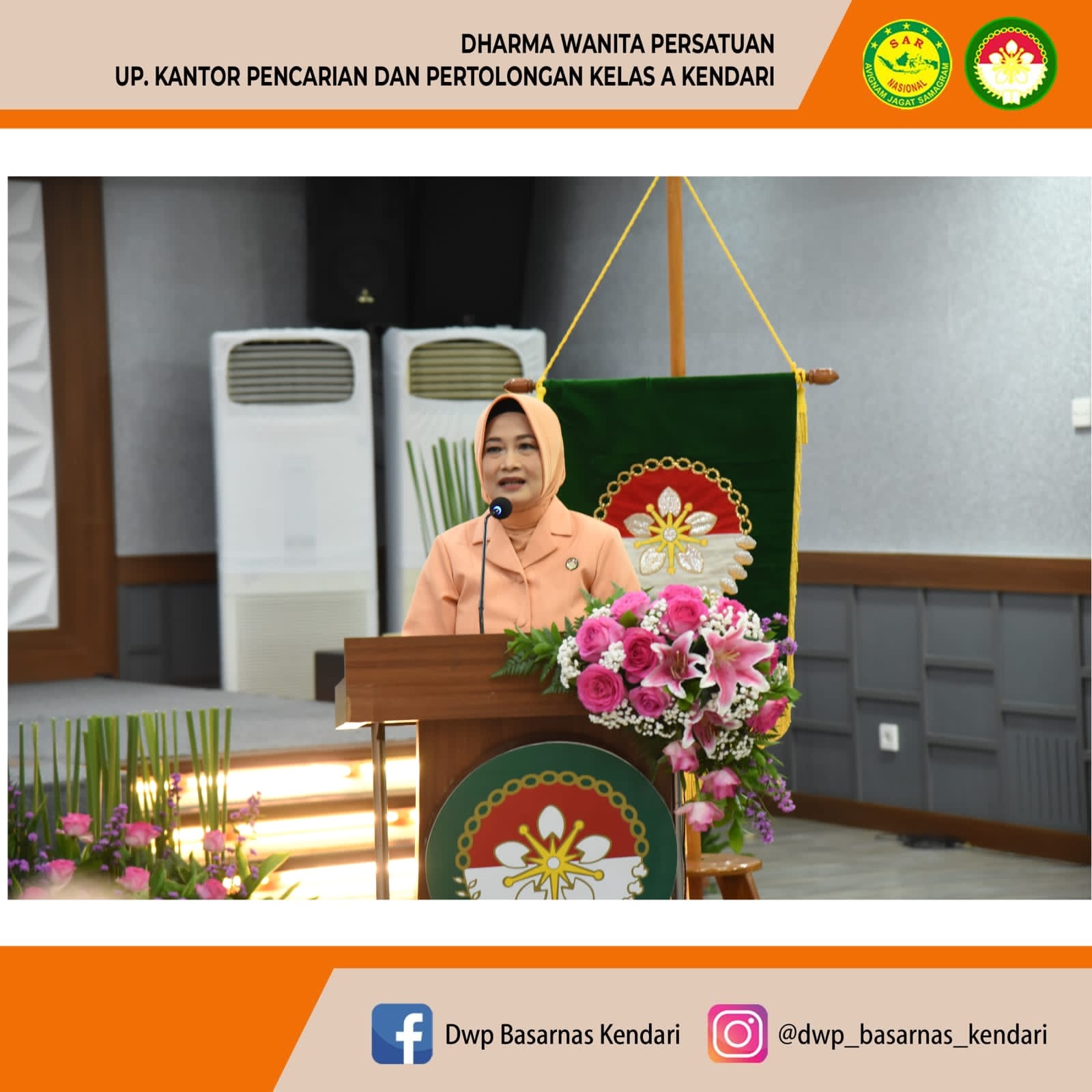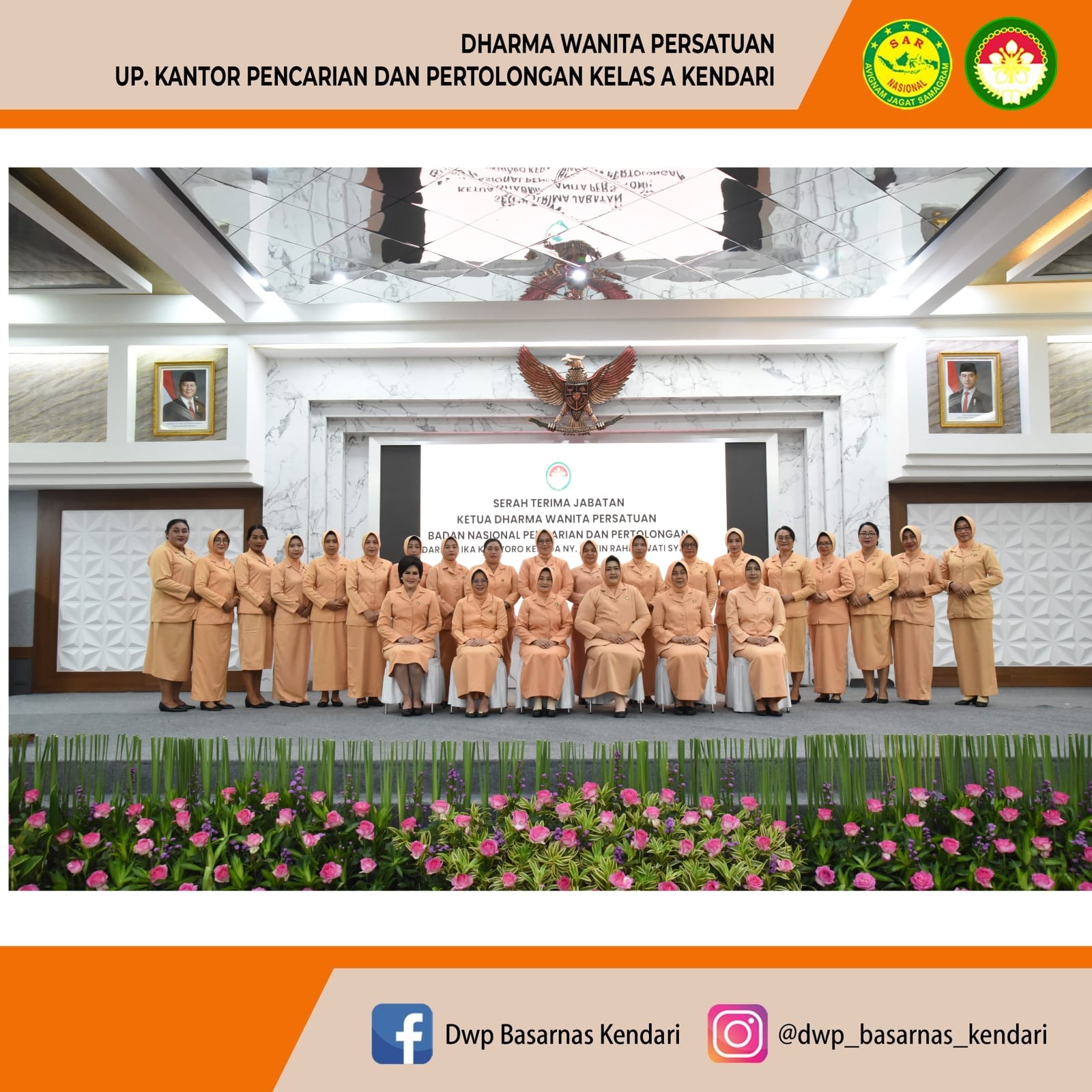 Ketua Dharma Wanita Persatuan Unsur Pelaksana Kantor Pencarian dan Pertolongan Kendari, Ny. Yenny Sutisna Amiruddin mengikuti kegiatan Serah Terima Jabatan Ketua Dharma Wanita Persatuan Badan Nasional Pencarian dan Pertolongan (Basarnas) dari Ny. Ika Kusworo Kepada Ny. Erwin Rahmawati Syafii, yang bertempat di Lantai 2 Gedung Basarnas Jakarta.