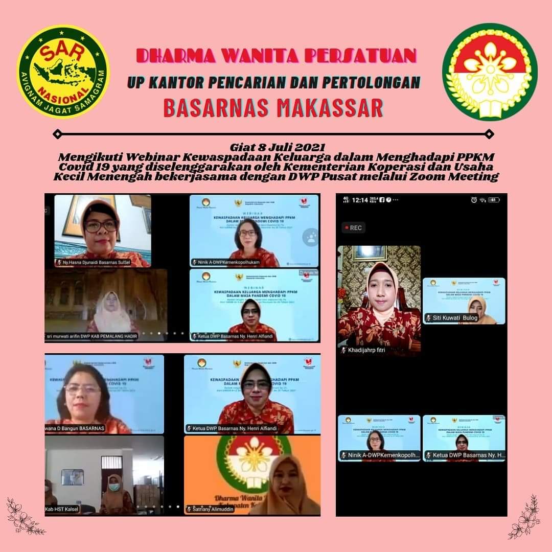 DWP UP Basarnas Makassar Mengikuti Webinar "Kewaspadaan Keluarga dalam Menghadapi PPKM Covid 19" dalam Rangka Hari Keluarga Nasional ke-28, Hari Koperasi ke-74 dan Hari UMKM ke-6 Tahun 2021 yang diselenggarakan oleh Kementerian Koperasi dan Usaha Kecil Menengah bekerjasama dengan DWP Pusat melalui Zoom Meeting