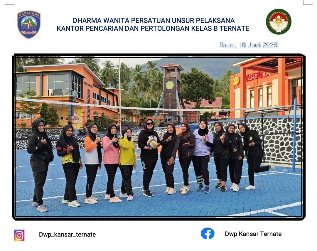 Selasa, 10 Juni 2025 Dharma Wanita Persatuan Unsur Pelaksana Kantor Pencarian dan Pertolongan Ternate Melaksanakan Giat Rutin Olahraga Bola Volly Bersama Yang berlangsung di Lapangan Kantor SAR Ternate