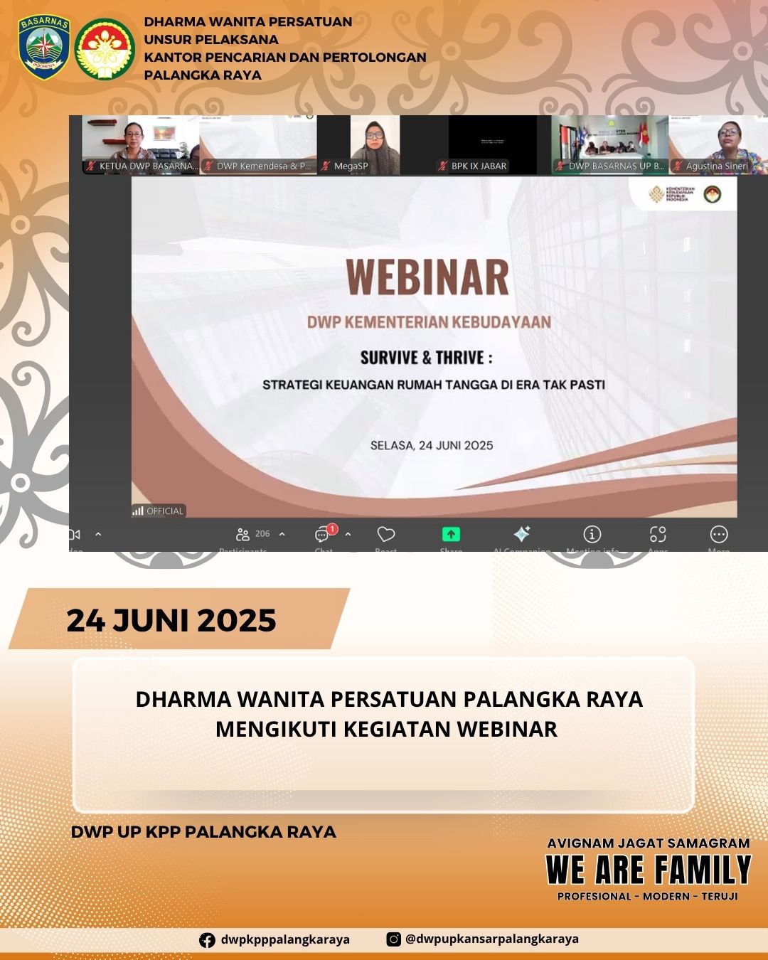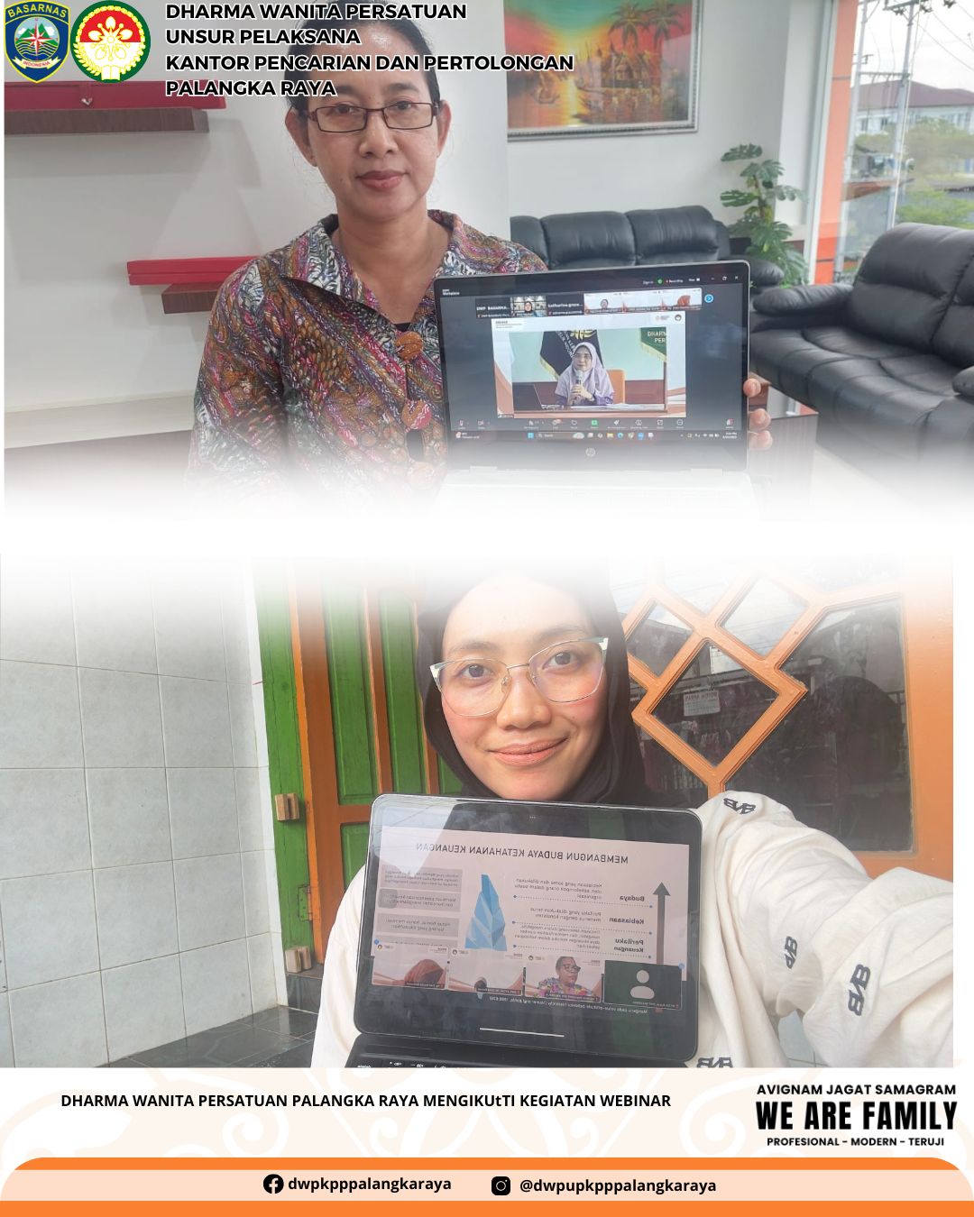 Ketua Dharma Wanita Persatuan Unsur Pelaksana Kantor Pencarian dan Pertolongan Palangka Raya, Ny. Anak Agung Konik Alit Supartana,Pengurus beserta Anggota Mengikuti Kegiatan Webinar Survive & Thrive yang diselenggarakan DWP Kementrian Kebudayaan dengan Tema Strategi Keuangan Rumah Tangga di Era Tak Pasti.