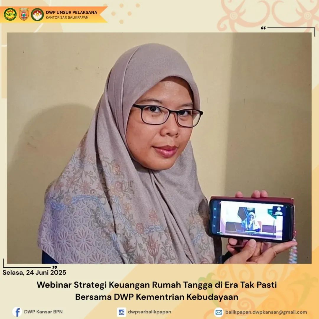Selasa, 24 Juni 2025 anggota DWP UP Kantor Pencarian dan Pertolongan Kelas A Balikpapan mengikuti webinar " Strategi Menghadapi Keuangan Rumah Tangga di Era Tak Pasti bersama DWP Kementrian Kebudayaan