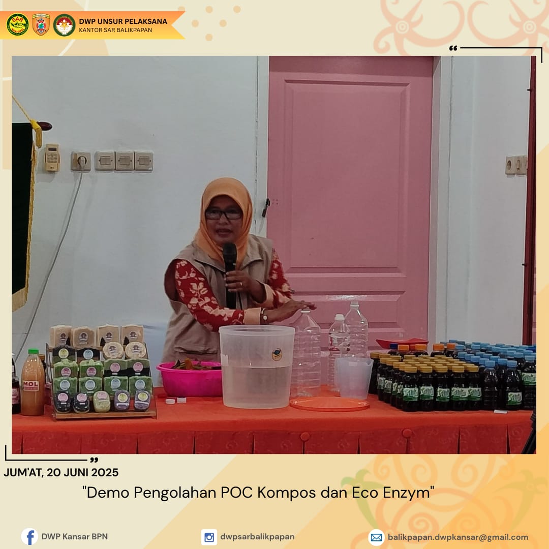 Jumat, 20 Juni 2025 anggota DWP UP Kantor Pencarian dan Pertolongan menghadiri pertemuan rutin DWP Kota Balikpapan yang diisi dengan kegiatan Demo Pengolahan POC Kompos dan Eco Enzym