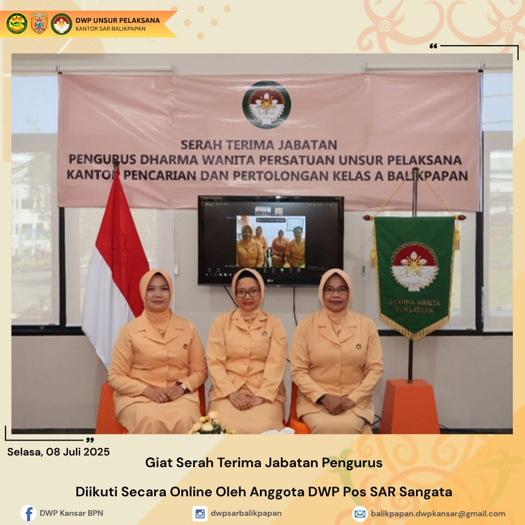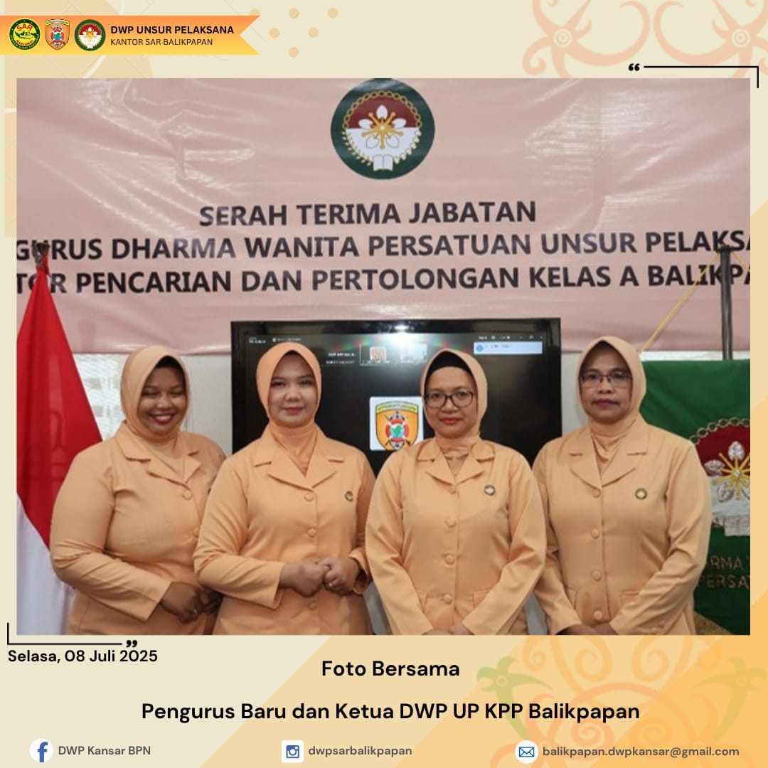 Selasa, 8 Juli 2025 DWP UP Kantor Pencarian dan Pertolongan Kelas A Balikpapan melaksanakan kegiatan Serah Terima Jabatan Wakil Ketua dari Ny. Masniyah Mujiono kepada Ny. Neti Anton Kurniawan serta Serah Terima Jabatan Ketua Bidang Sosial Budaya dari Ny. Ika Syafaruddin kepada Ny. Masniyah Mujiono