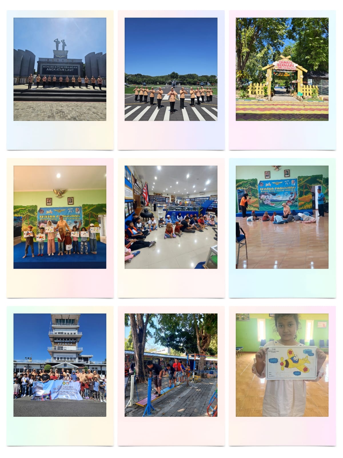 c. Selanjutnya adalah kegiatan Wisata Edukasi dengan uraian kegiatan sebagai berikut : DWP berangkat dari kantor UP KPP Surabaya pada pukul 09.00 menuju Rumah Pintar Juanda Cendekia di jl. Raya Juanda no. 45, Sidoarjo, Jawa Timur. Kegiatan ini diikuti oleh 40 orang yang terdiri dari 16 orang tua dan 24 anak-anak. Di Rumpin Juanda Cendekia disambut oleh Bapak Marsudi, S.Pd, M.M selalu penanggung jawab Lokasi. Kegiatan ini dilaksanakan dengan tujuan menambah wawasan bagi anggota DWP UP KPP Surabaya serta sarana edukasi serta rekreasi bagi anak-anak. Harapannya, hasil kunjungan wisata edukasi ini selain dapat menambah wawasan anak-anak melalui film edukatif, sarana hiburan melalui kegiatan senam bersama, game dan mewarnai, juga dapat menambah pengetahuan terkait dunia penerbangan dan sejarah militer Indonesia karena menyajikan koleksi pesawat dan peralatan penerbangan militer yang pernah digunakan oleh TNI AL. Kegiatan yang dilakukan anak-anak di Rumpin antara lain Senam bersama, menonton film edukatif, game menarik serta kegiatan mewarnai. Selanjutnya rombongan bergerak ke museum penerbangan TNI AL yang lokasinya tidak berdekatan dengan Rumpin Juanda Cendekia. Di museum ini rombongan disambut oleh pemandu dari bapak TNI AL yang akan menemani dan memberikan edukasi terkait lokasi tersebut. Kegiatan pertama adalah melihat koleksi beragam jenis pesawat yang pernah digunakan dalam operasi militer TNI AL, termasuk pesawat tempur dan pesawat angkut. Selanjutnya menyajikan pertunjukan film pendek yang menampilkan sejarah dan perkembangan penerbangan militer di Indonesia. Tak lupa pula rombongan diajak naik Pesawat Latih TNI AL, Helikopter TNI AL, dan Boeing 737-400 yang memberikan pengalaman unik bagi pengunjung untuk merasakan sensasi berada di dalam pesawat militer dan angkut, serta melihat Lalu Lintas Pesawat dengan menyaksikan secara langsung pesawat yang lepas landas dan mendarat dari area yang telah disediakan.