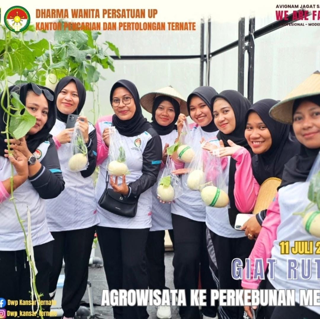 Jumat, 11 Juli 2025 Dharma Wanita Persatuan Unsur Pelaksana Kantor Pencarian dan Pertolongan Ternate melaksanakan kunjungan Agro Wisata di perkebunan melon yang berada di Gambesi, kota ternate. Para ibu-ibu DWP terjun langsung dalam pemetikan buah melon tersebut.