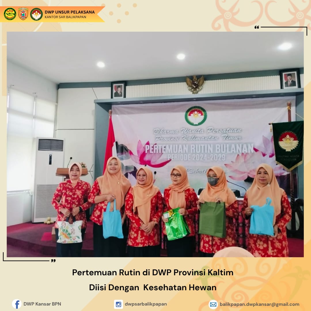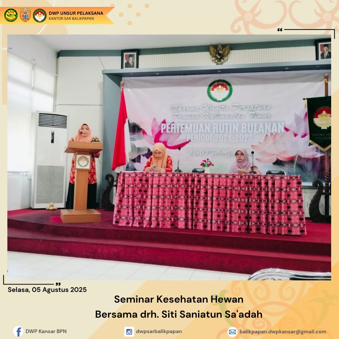 Selasa, 5 Agustus 2025, Dharma Wanita Persatuan Unsur Pelaksana Kantor Pencarian dan Pertolongan Balikpapan yang diwakili oleh Ibu Dakka Sumarno dari DWP Pos SAR Samarinda turut serta dalam kegiatan pertemuan rutin yang diselenggarakan oleh DWP Provinsi Kalimantan Timur. Pertemuan ini diisi dengan Seminar Kesehatan Hewan dengan tema "Kenali dan Waspadai Penyakit Zoonosis di Lingkungan Kita". Seminar ini menghadirkan Narasumber yang kompeten, drh. Siti Saniatun Sa'adah, yang memberikan pengetahuan dan wawasan yang berharga tentang penyakit zoonosis dan cara pencegahannya. Melalui kegiatan ini, diharapkan para anggota DWP dapat meningkatkan kesadaran dan pengetahuan tentang pentingnya kesehatan hewan dan keselamatan lingkungan, serta dapat mengambil langkah-langkah preventif untuk melindungi diri dan keluarga dari penyakit zoonosis.