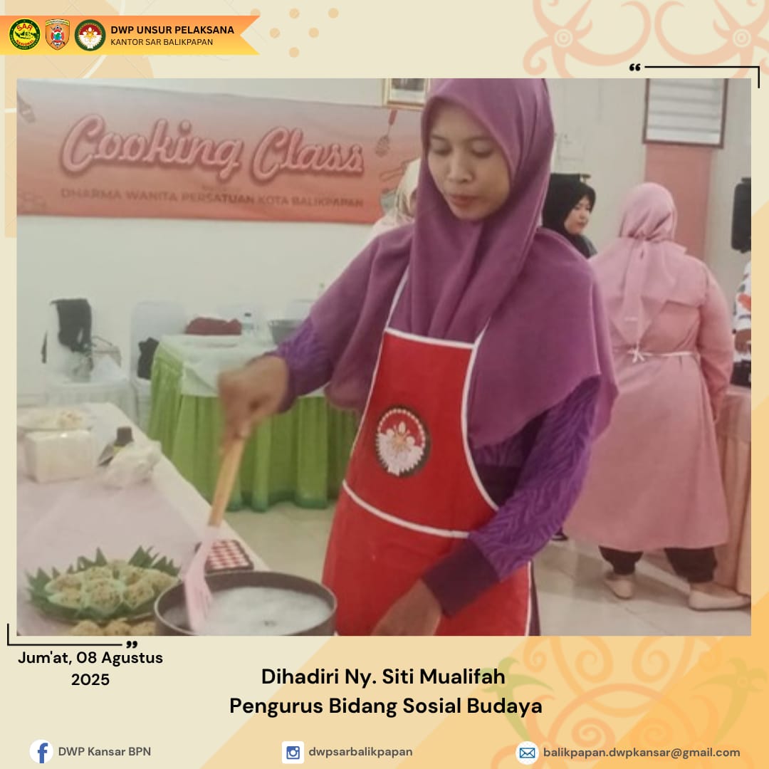 Jumat, 8 Agustus 2025 pukul 14.30 WITA, Dharma Wanita Persatuan UP KPP Balikpapan mengikuti kegiatan "Sharing Resep" bersama Chef Yongki. Kegiatan ini diwakili oleh Ny. Siti Mualifah. Dalam acara yang digelar oleh DWP Kota Balikpapan, Chef Yongki membagikan 5 resep lezat, yaitu: 1. Ayam Goreng Wangi: hidangan ayam dengan aroma wangi yang menggugah selera 2.Triffle Pudding: puding berlapis dengan rasa manis yang nikmat 3.Onde Onde: kudapan tradisional dengan isi manis di dalamnya 4.Chiffon Cake: kue lembut dengan rasa yang ringan dan menyegarkan 5.Siomay Bandung: hidangan khas Bandung dengan rasa yang autentik Dengan adanya kegiatan ini, diharapkan para peserta dapat menambah pengetahuan dan keterampilan dalam memasak serta mencoba resep-resep yang dibagikan oleh Chef Yongki.