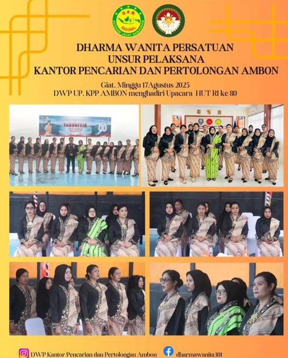 Ambon, 17 Agustus 2025, Ketua Dharmawanita Kantor Pencarian dan Pertolongan Ambon Ny, Maryam Arafah bersama Pengurus dan Anggota mengikuti Upacara Memperingati HUT RI ke 80 di Kantor Pencarian dan Pertolongan Ambon.