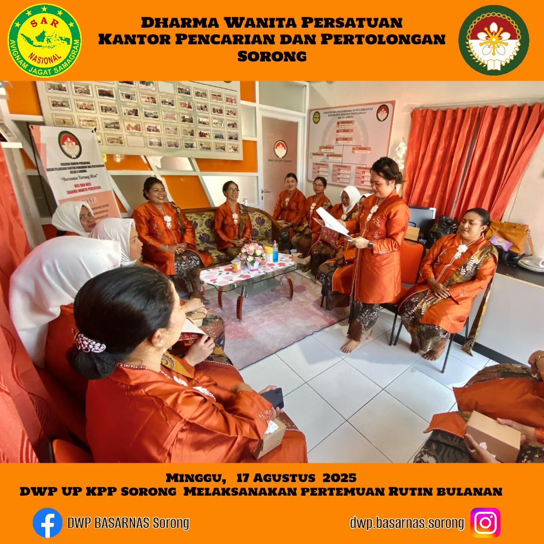 Minggu, 17 Agustus 2025 DWP UP KPP SORONG melaksanakan pertemuan rutin bulanan Yang di isi dengan : * Arahan dari Ketua DWP UP Kantor Pencarian dan Pertolongan Sorong * laporan program kerja dari masing-masing bidang * serba serbi Pertemuan berlangsung di ruangan DWP UP Kantor Pencarian dan Pertolongan Sorong.