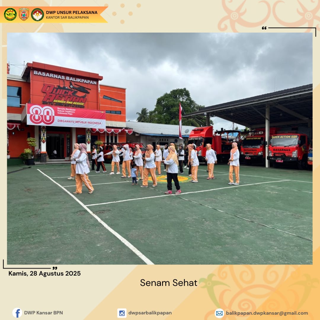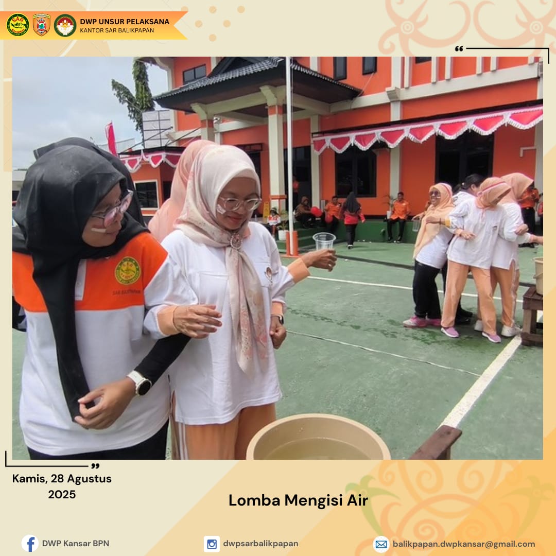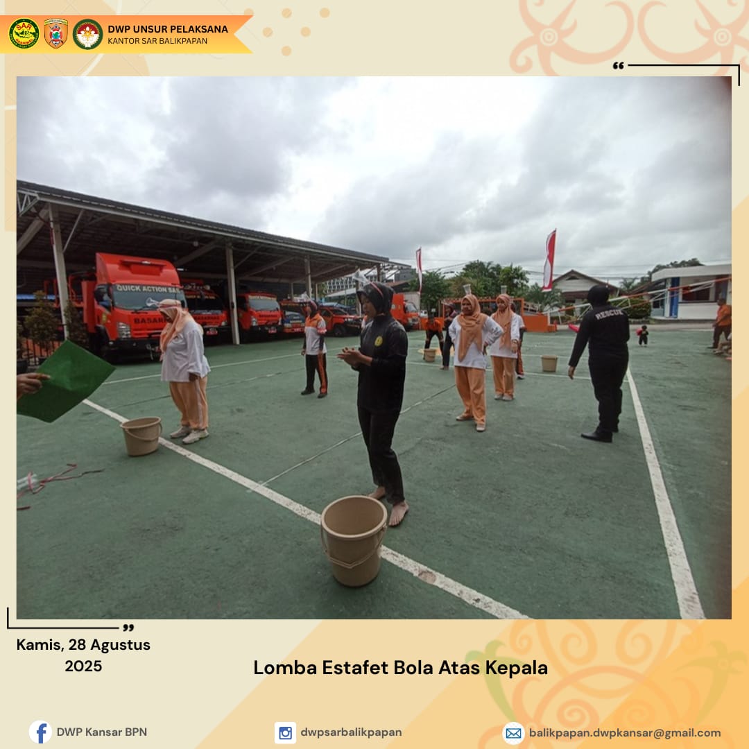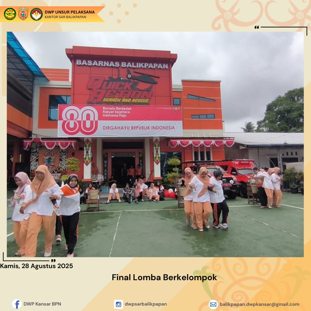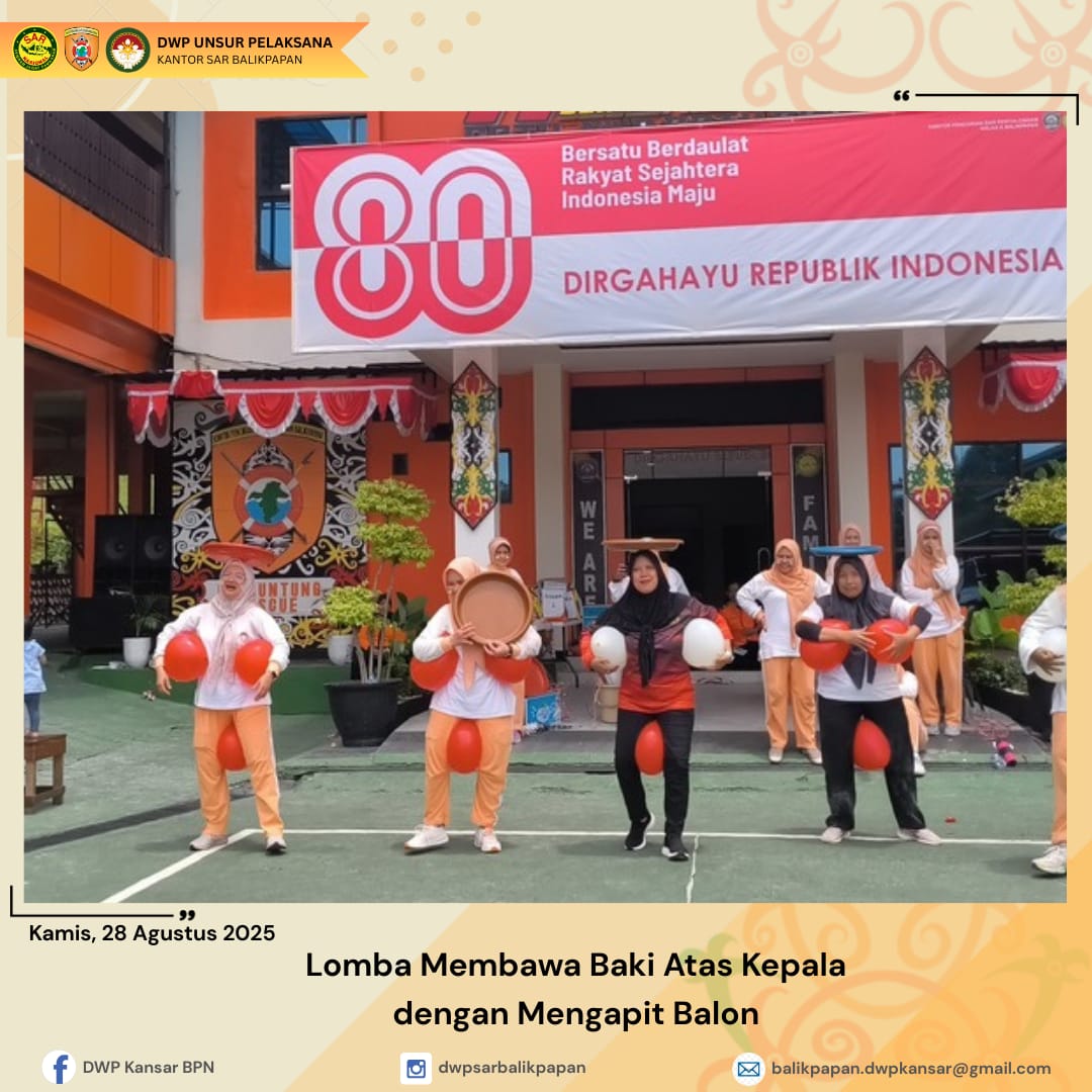 Kamis 28 Agustus 2025, DWP UP Kantor Pencarian dan Pertolongan Balikpapan mengadakan lomba 17-an dalam rangka memeriahkan HUT Ke- 80 Republik Indonesia. Kegiatan ini diawali dengan senam bersama dan dilanjutkan dengan berbagai jenis lomba yang menguji kekompakan dan kreativitas peserta. Adapun berbagai lomba yang dilaksanakan yaitu lomba estafet tepung, lomba estafet bola, lomba estafet air dan lomba membawa baki dengan himpitan balon. Suasana penuh tawa dan sorak-sorai memenuhi lapangan menciptakan momen yang tak terlupakan bagi semua peserta dan penonton. Dengan semangat kebersamaan dan kompetisi yang sehat, lomba 17an ini menjadi perayaan yang sangat menyenangkan.