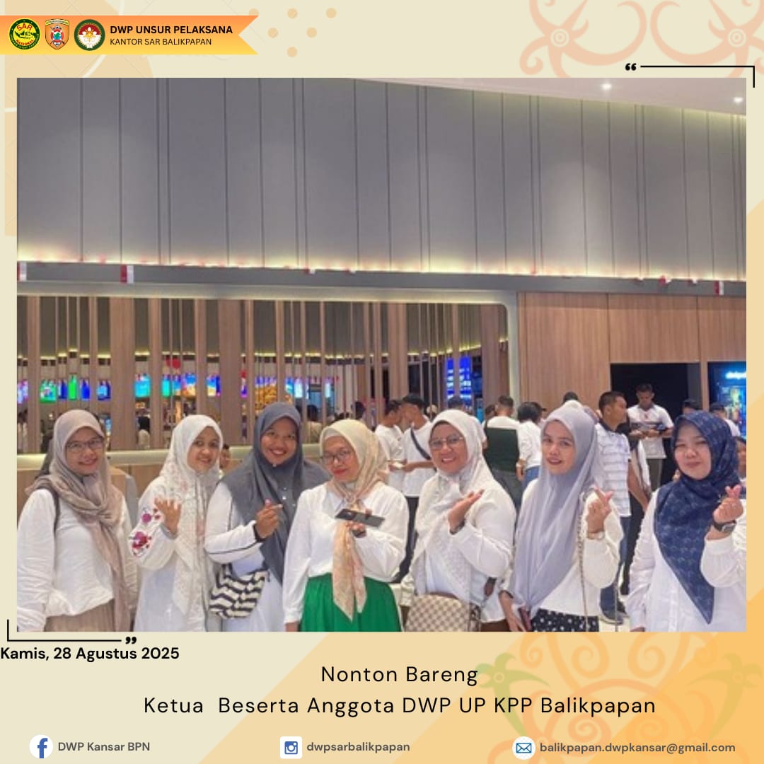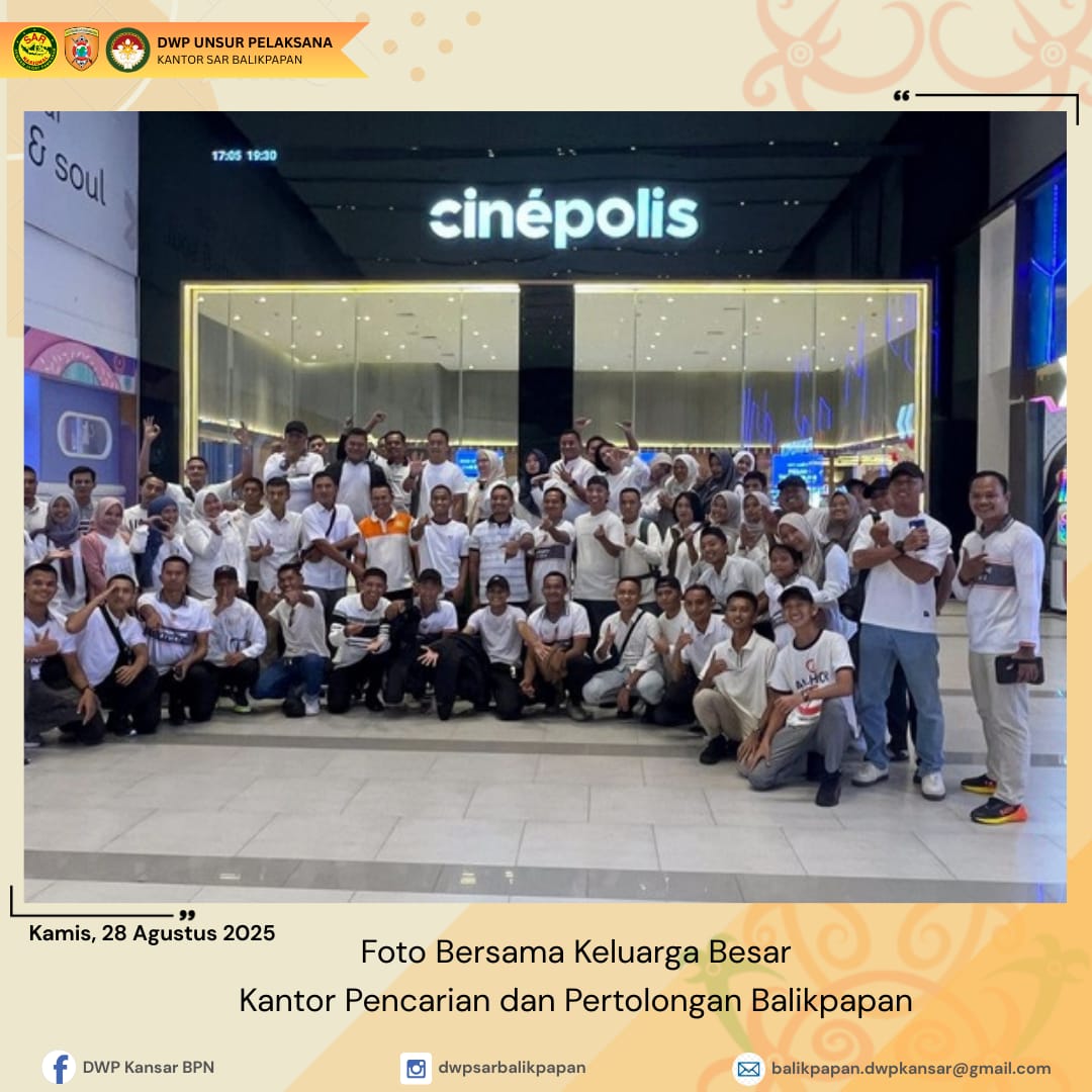 Kamis 28 Agustus 2025, DWP UP Kantor Pencarian dan Pertolongan Balikpapan menghadiri undangan Kepala Kantor Pencarian dan Pertolongan Balikpapan dalam kegiatan nonton bareng film "Pencarian Terakhir" di Cinepolis Living Plaza Balikpapan. Giat ini diikuti anggota DWP dengan penuh antusias. Film yang menampilkan anggota Basarnas dalam pencarian orang hilang di Gunung menjadi daya tarik tersendiri bagi keluarga besar Basarnas untuk menikmati tayangan film dari awal hingga akhir. Diharapkan melalui kegiatan ini dapat mempererat silaturahmi Keluarga Besar Kantor Pencarian dan Pertolongan Balikpapan