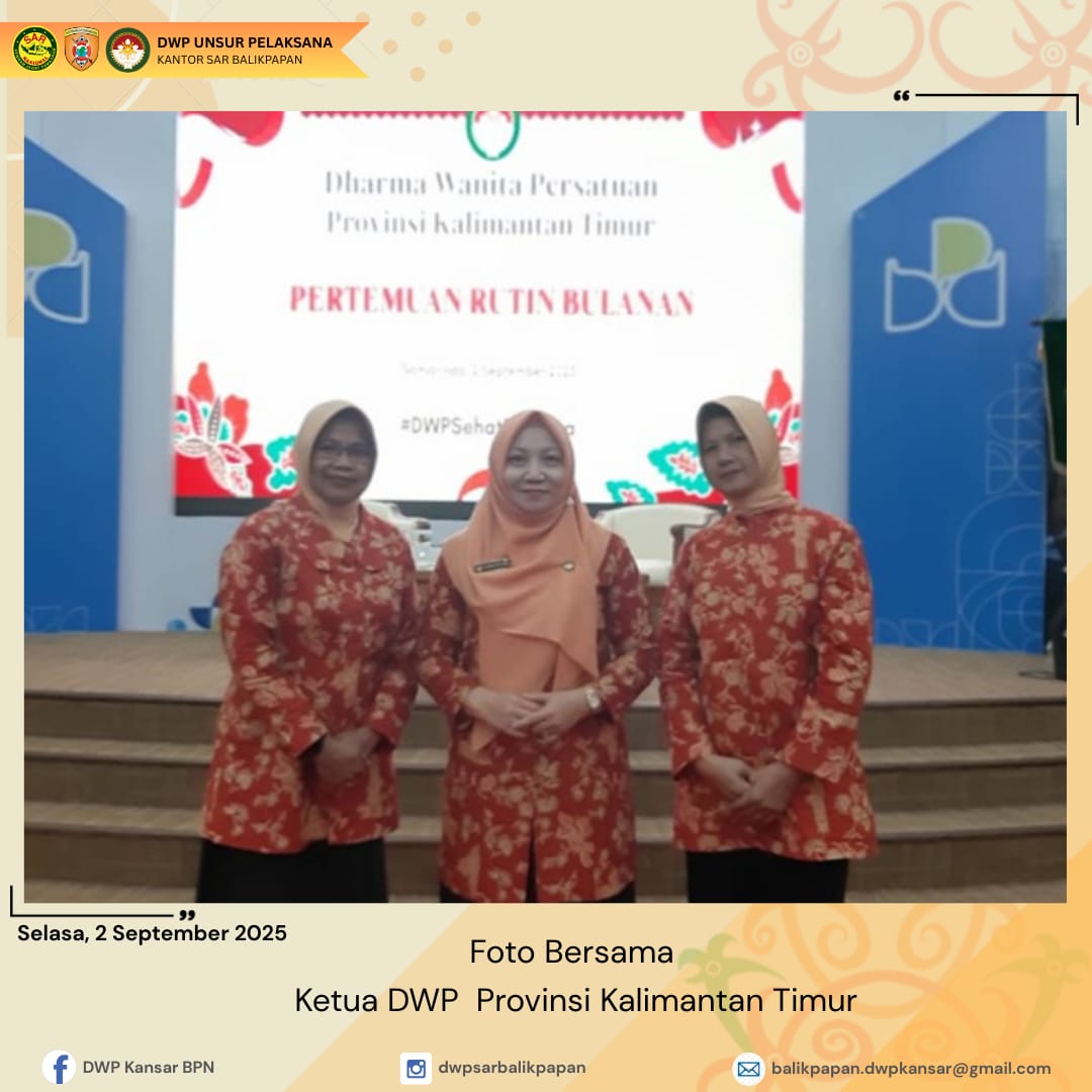 Selasa 2 September 2025, DWP UP Kantor Pencarian dan Pertolongan Balikpapan diwakili oleh Ny. Masniah Mujiono dan Ny. Ramadhani Setyo menghadiri pertemuan rutin yang diselenggarakan oleh DWP Provinsi Kalimantan Timur. Pertemuan diisi dengan seminar yang mengangkat tema "Perempuan Tangguh, Keluarga Kuat, Kalimantan Timur Maju". Seminar ini bertujuan untuk memberikan inspirasi dan motivasi kepada perempuan dalam membangun keluarga yang kuat dan berkontribusi pada kemajuan daerah, serta menambah wawasan tentang peran penting perempuan dalam menciptakan keluarga harmonis dan masyarakat yang sejahtera. Kegiatan ini menjadi ajang yang produktif untuk mempererat silaturahmi antar anggota DWP se-Kalimantan Timur.