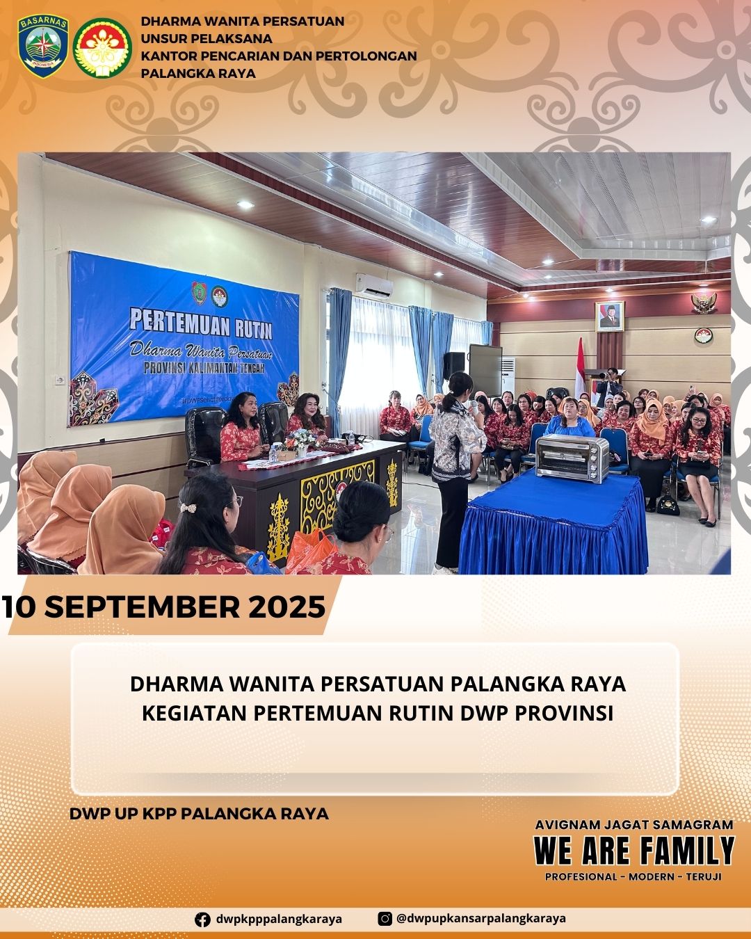 pengurus dharma wanita persatuan kantor pencarian dan pertolongan palangka raya menghadiri pertemuan rutin DWP Provinsi Kalimantan Tengah, diisi dengan acara keterampilan "membuat kue nastar, lidah kucing dan nuttela butter" bertempat di Gedung Sekretariat DWP Provinsi Kalimantan Tengah.