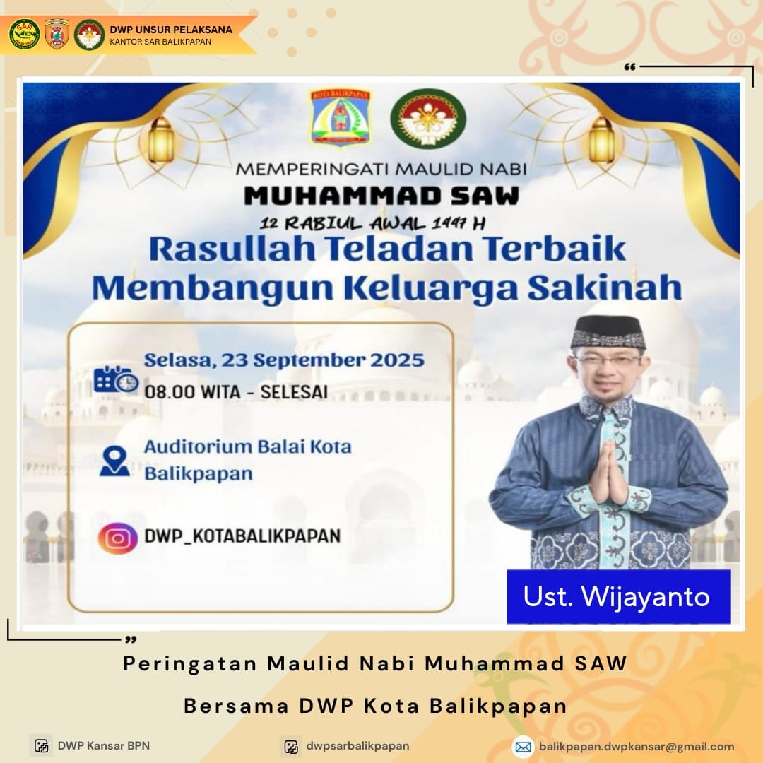Selasa, 23 September 2025 DWP UP Kantor Pencarian dan Pertolongan Balikpapan yang diwakili oleh Ny. Nety Anton Kurniawan dan Ny. Febriani Nur Ngalim, memenuhi undangan DWP Kota Balikpapan pada acara Peringatan Maulid Nabi Muhammad SAW di Auditorium Balai Kota Balikpapan. Acara yang penuh hikmah ini diisi dengan tausiah yang disampaikan oleh Ustadz Wijayanto, yang memberikan pencerahan dan motivasi spiritual kepada seluruh jemaah. Dengan penuh khidmat, para hadirin mendengarkan setiap kata-kata bijak dan refleksi tentang akhlak serta ajaran Nabi Muhammad SAW. Kegiatan ini menjadi momen berharga untuk memperingati kelahiran Nabi Muhammad SAW, sekaligus memperkuat tali silaturahmi antaranggota DWP se-Kota Balikpapan.