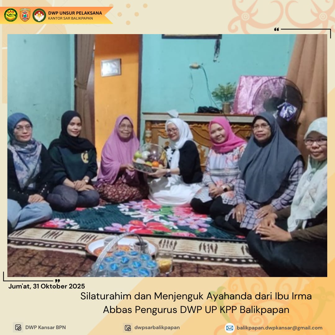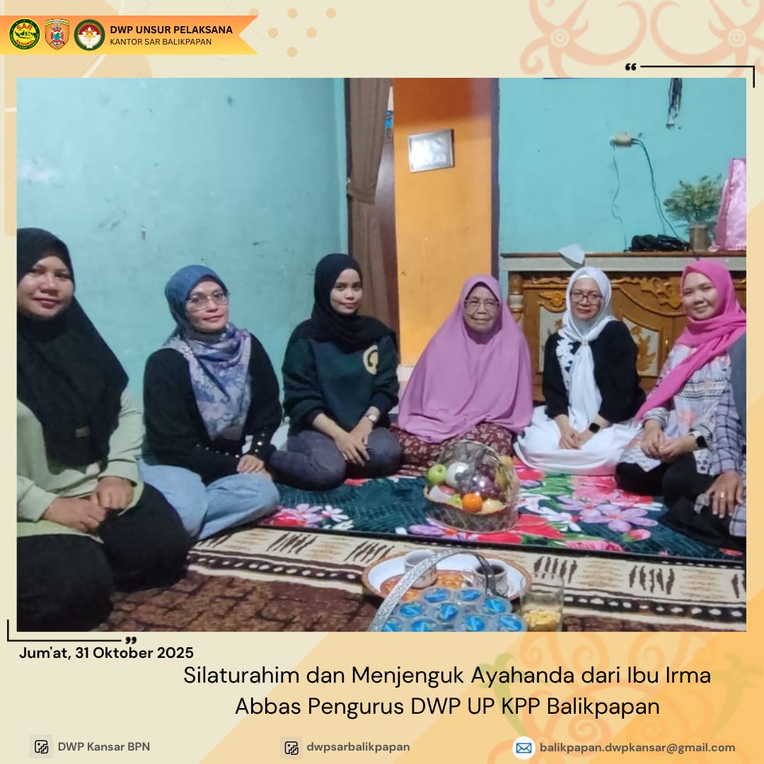 Jumat 31 Oktober 2025, Ketua DWP UP Kantor Pencarian dan Pertolongan Kelas A Balikpapan Ibu Indah Dody Setiawan bersama anggota Bidang Sosial Budaya melakukan kunjungan dan silaturahmi ke rumah ayahanda Ny. Irma Abbas pasca operasi. Kunjungan ini merupakan bentuk kepedulian dan empati DWP UP Kantor Pencarian dan Pertolongan Kelas A Balikpapan terhadap anggotanya dengan membawa doa dan harapan, untuk segera sembuh.