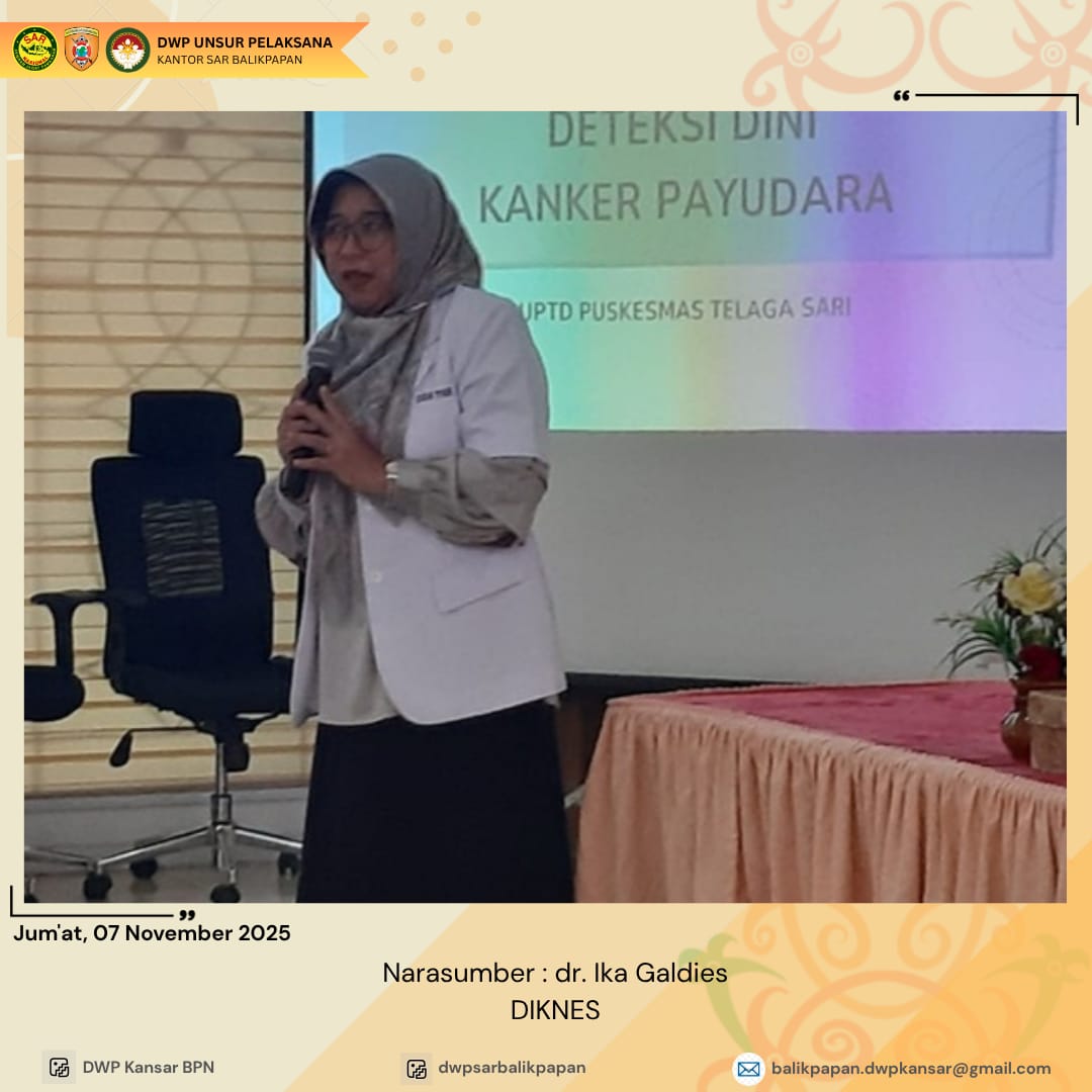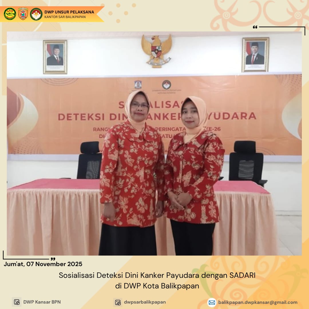 Jum'at 7 November 2025, DWP UP Kantor Pencarian dan Pertolongan Kelas A Balikpapan diwakili oleh Ny. Masniah Mujiono dan Ny. Adina Syaiful menghadiri Pertemuan Rutin DWP Kota Balikpapan. Pertemuan ini diisi dengan Sosialisasi Deteksi Dini Kanker Payudara Dengan Metode SADARI (Periksa Payudara Sendiri) yang disampaikan oleh dr. Ika Gladies dari Diknes Balikpapan. Kegiatan ini bertujuan untuk meningkatkan kesadaran dan pengetahuan para anggota DWP tentang pentingnya deteksi dini kanker payudara dan cara melakukan SADARI sebagai upaya pencegahan. Dengan adanya sosialisasi ini, diharapkan anggota DWP dapat meningkatkan kesadaran akan kesehatan dan mengambil langkah-langkah preventif untuk menjaga kesehatan payudara.