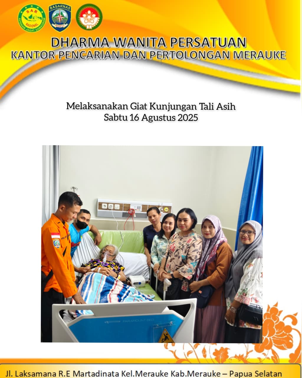 16/08/2025, DWP UP Kantor Pencarian dan Pertolongan Merauke mengadakan giat kunjungan kasih kepada orang tua dari pak Hartono/pegawai SAR Merauke yang dirawat inap di RSBP Merauke, diikuti oleh 5 orang anggota.