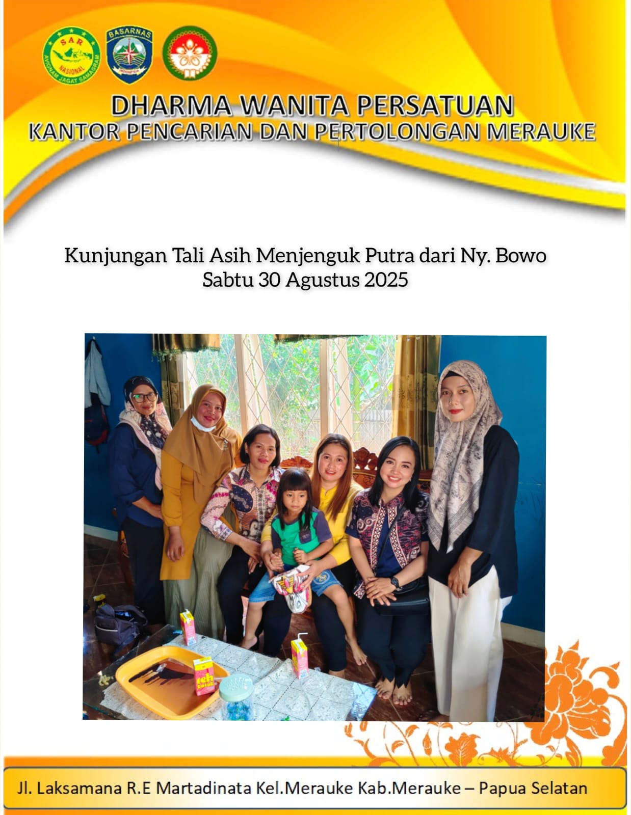 30/08/2025, DWP UP Kantor Pencarian dan Pertolongan Merauke mengadakan kunjungan kasih kepada anak dari Ny.Bowo yang sedang sakit, diikuti oleh 5 orang anggota.