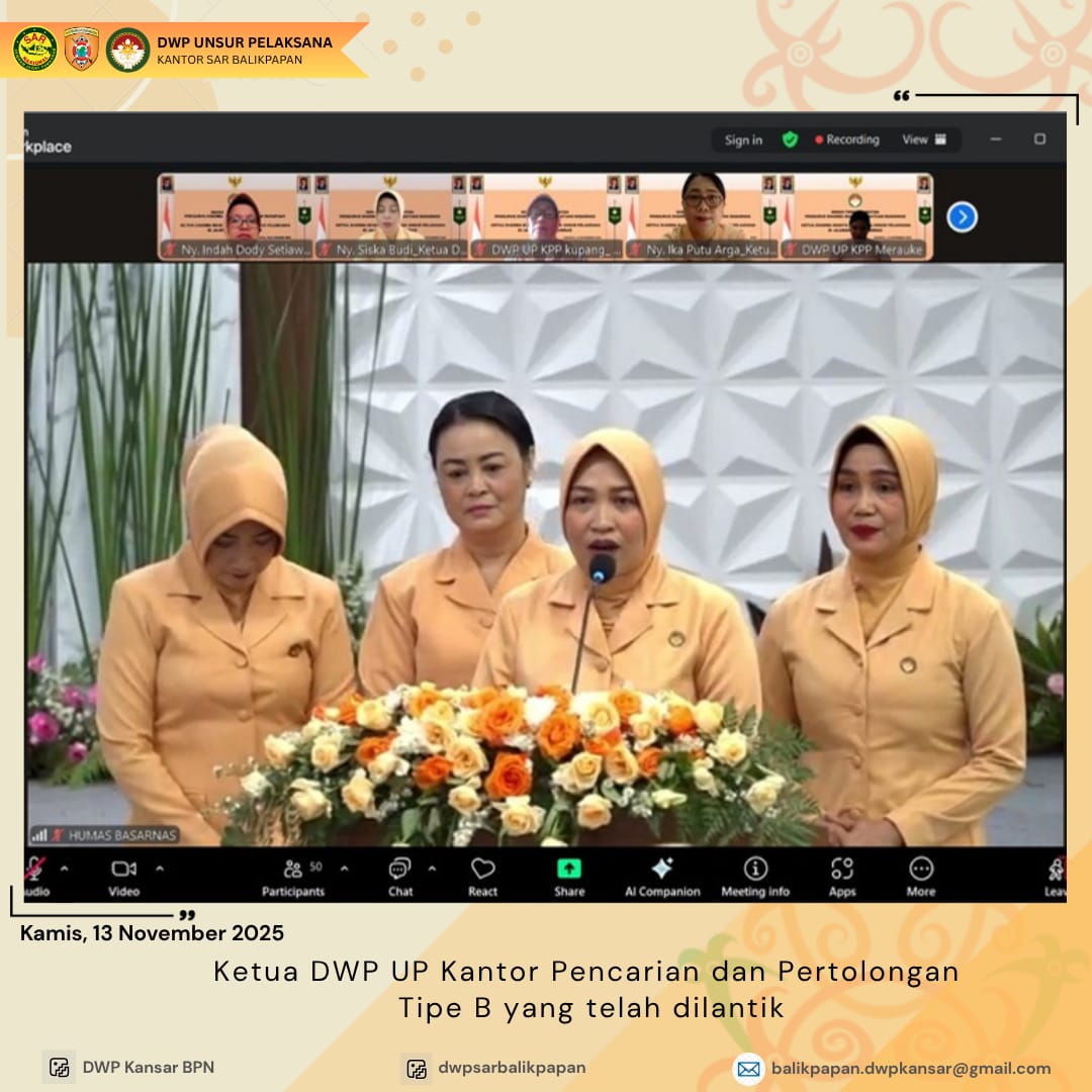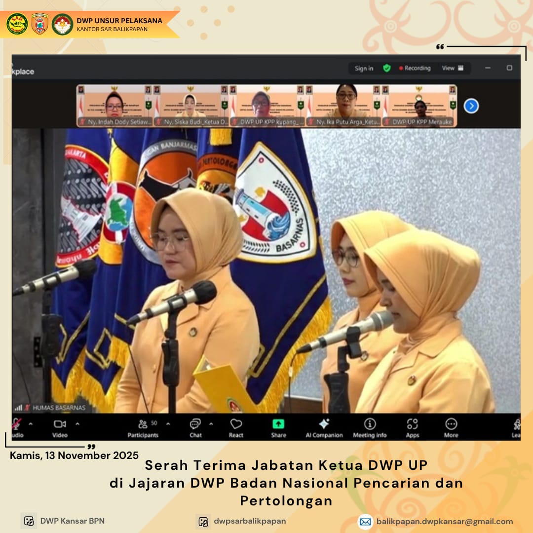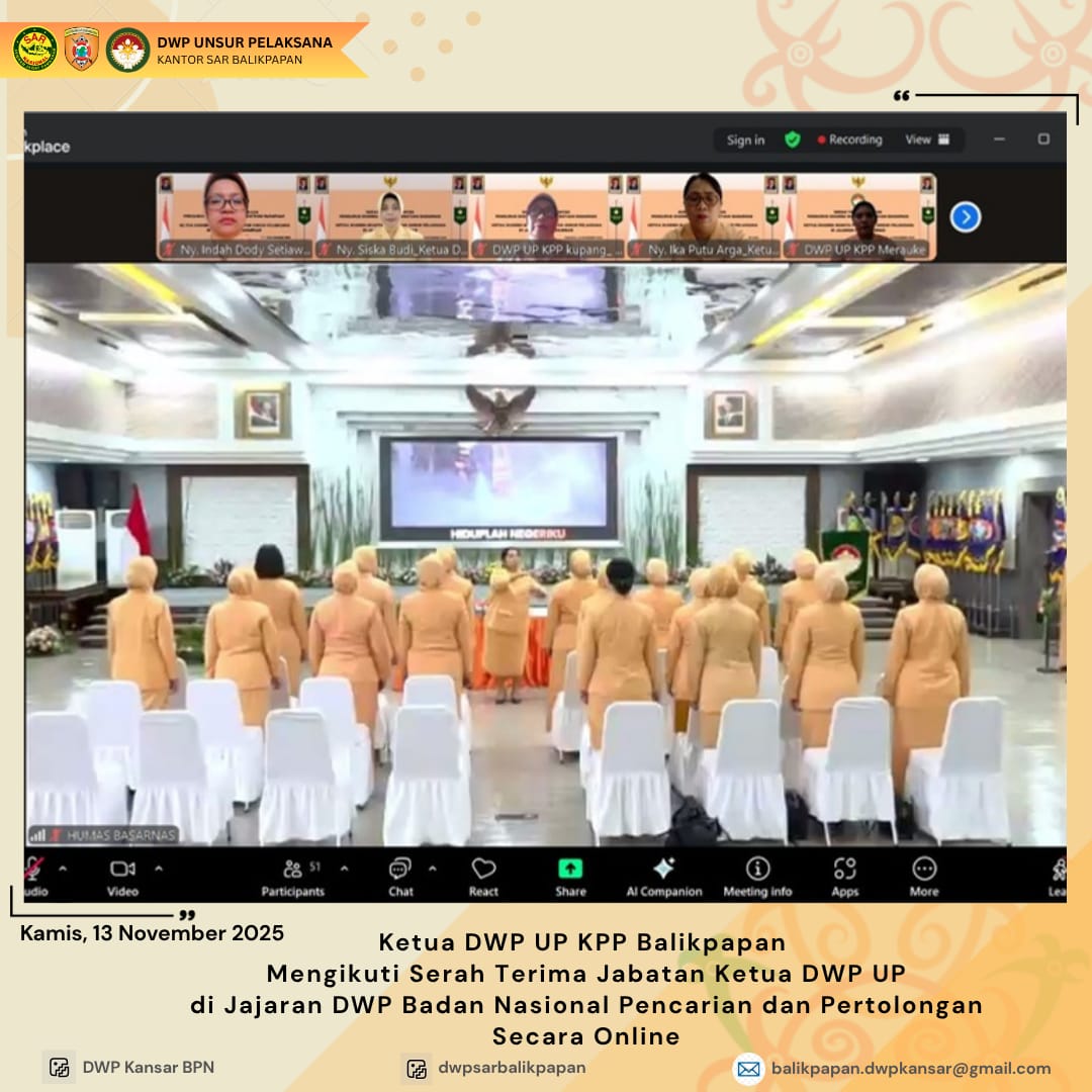 Kamis 13 November 2025, Ketua DWP UP Kantor Pencarian dan Pertolongan Kelas A Balikpapan Ny. Indah Dody Setiawan dan Wakil Ketua DWP UP KPP Balikpapan Ny. Neti Anton Kurniawan mengikuti Serah Terima Jabatan Ketua Dharma Wanita Persatuan Unsur Pelaksana di Jajaran Dharma Wanita Persatuan Badan Nasional Pencarian dan Pertolongan secara online. Ny. Indah Dody Setiawan dan Ny. Neti Anton Kurniawan mengikuti acara ini dengan penuh semangat dan komitmen untuk terus mendukung DWP Badan Nasional Pencarian dan Pertolongan