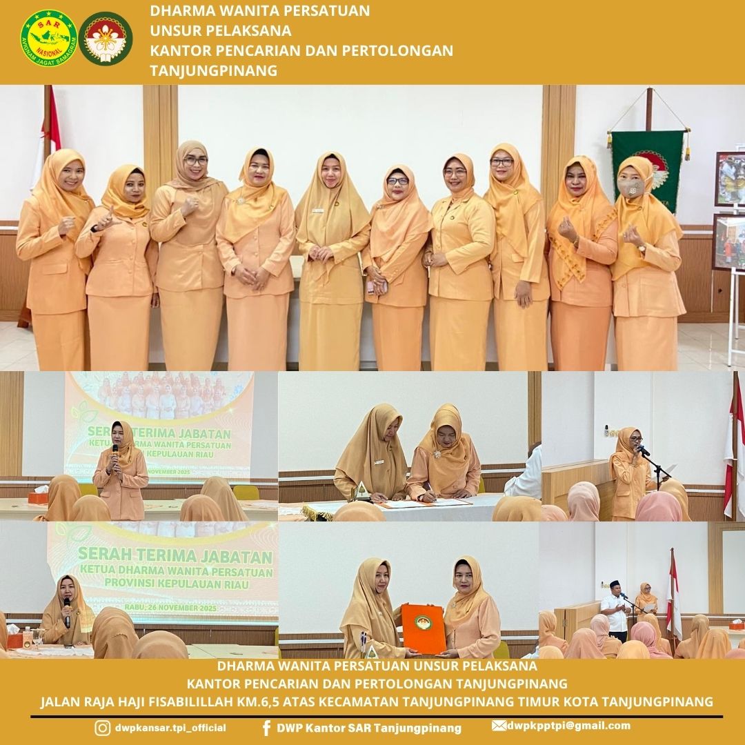 Rabu, 26 November 2025, Dharma Wanita Persatuan Unsur Pelaksana Kantor Pencarian dan Pertolongan Tanjungpinang Menghadiri Acara Serah Terima Jabatan Ketua DWP Provinsi Kepulauan Riau disejalankan dengan Arisan DWP Provinsi Kepulauan Riau Bulan November Tahun 2025 Bertempat di Sekretariat DWP Provinsi Kepulauan Riau.