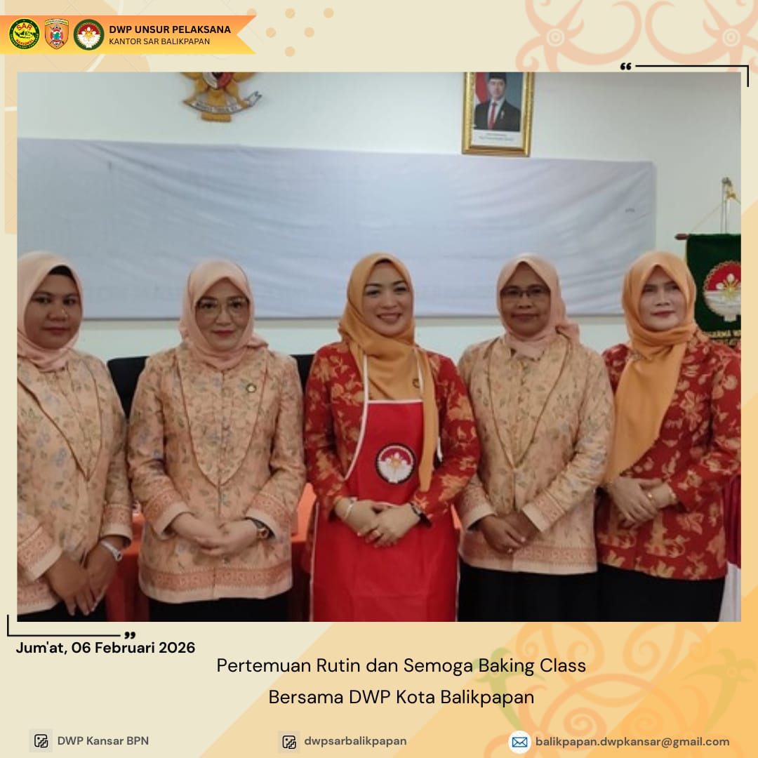 Jum'at 06 Februari 2026, Perwakilan Anggota DWP UP KPP Balikpapan, Ny. Masniyah Mujiono dan Ny. Satriani Dwi Adi Wibowo, menghadiri Pertemuan Rutin dan Demo Baking Class yang diselenggarakan oleh DWP Kota Balikpapan. Kegiatan ini menjadi ajang silaturahmi dan berbagi ilmu, serta meningkatkan kreativitas anggota dalam bidang kuliner. Dengan semangat dan antusiasme, Ny. Masniyah dan Ny. Satriani mengikuti demo baking class, memperkaya pengalaman dan menambah wawasan baru.