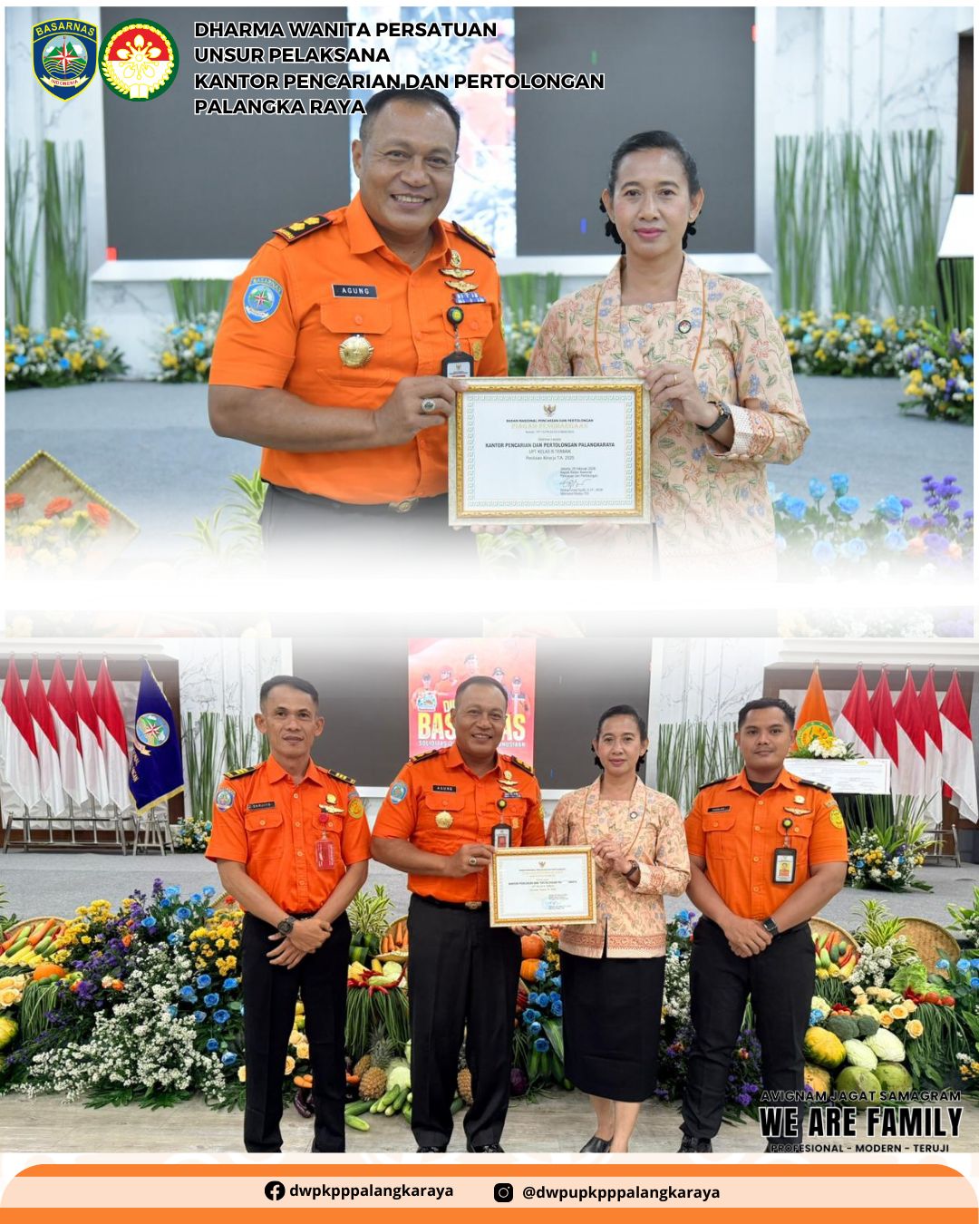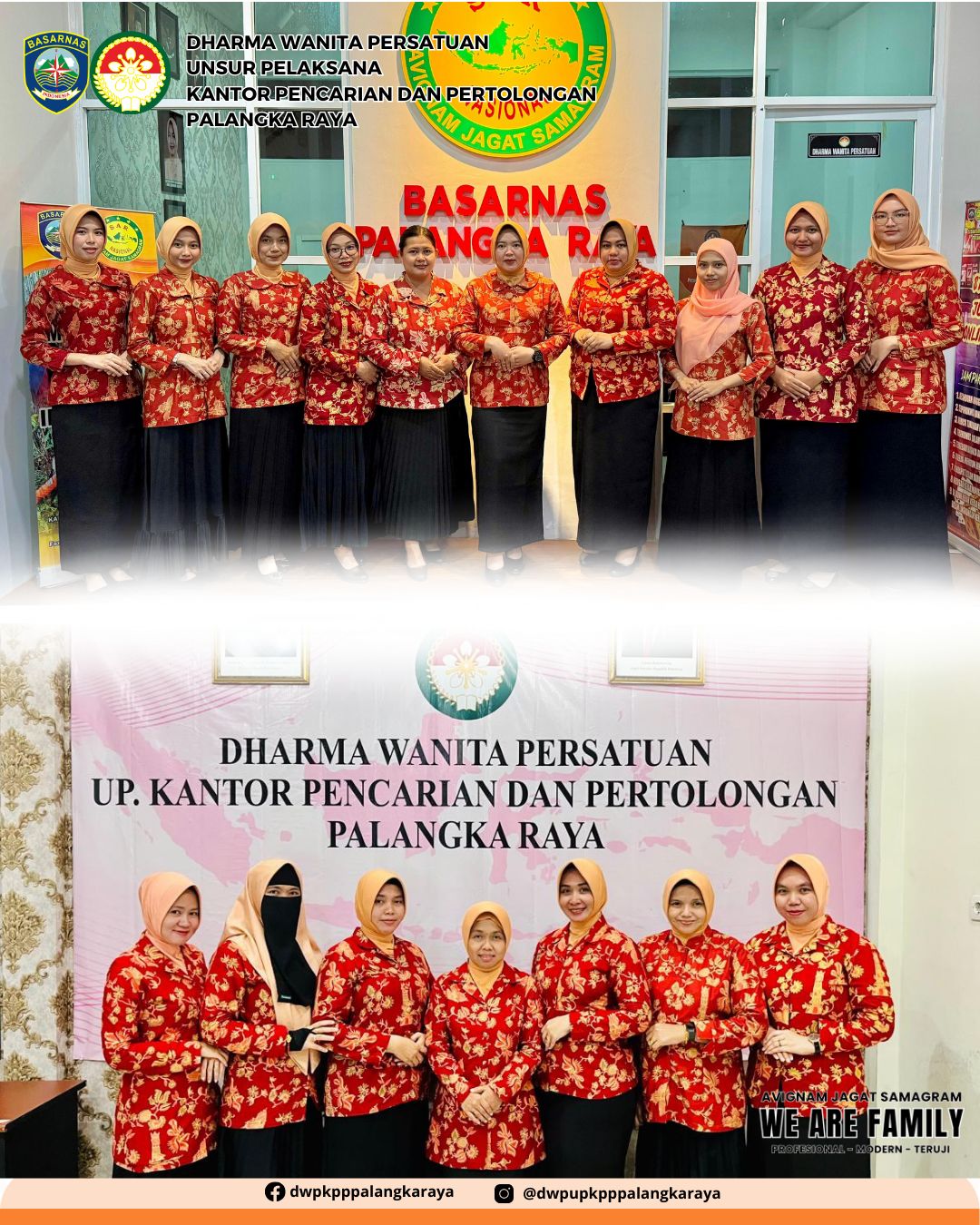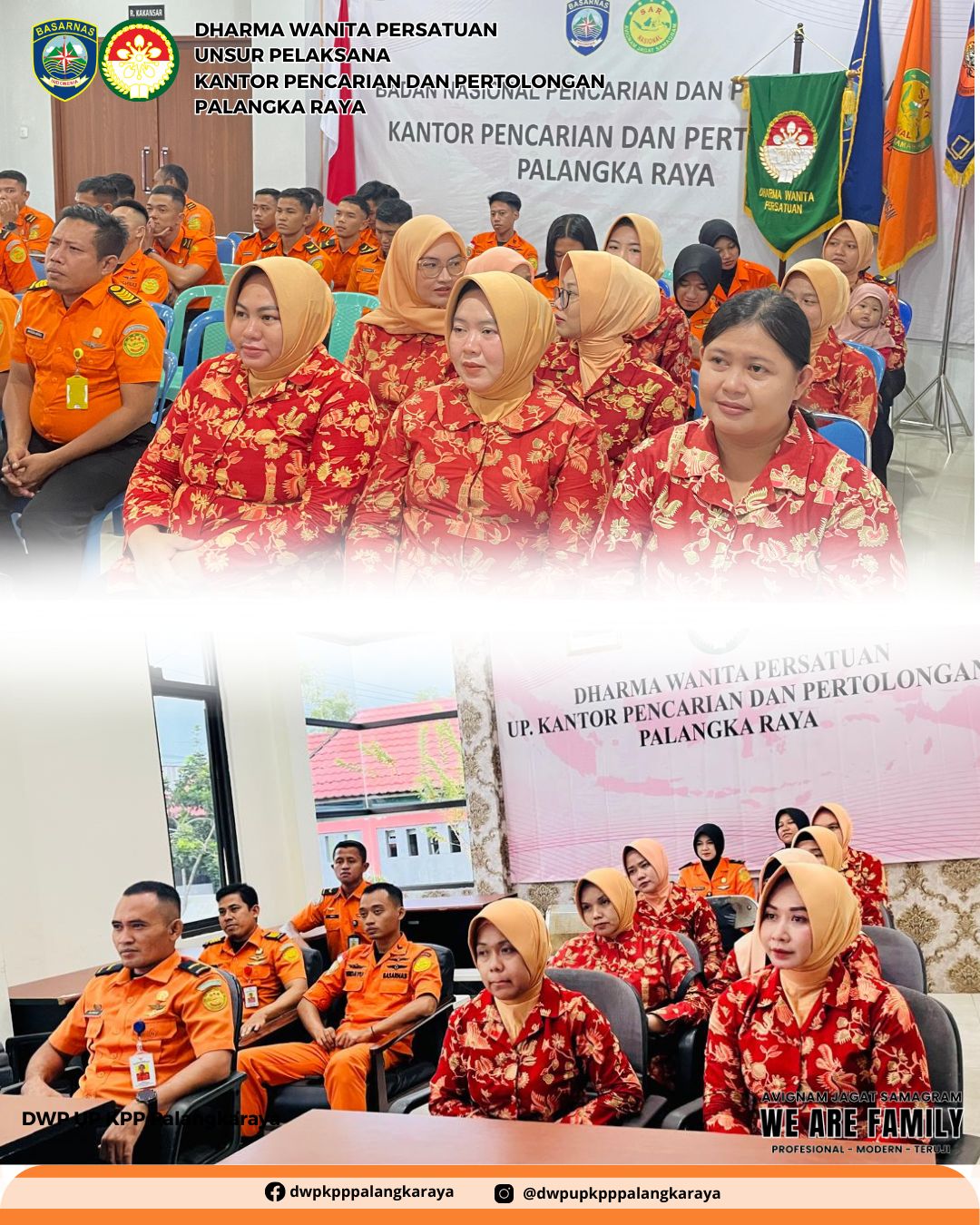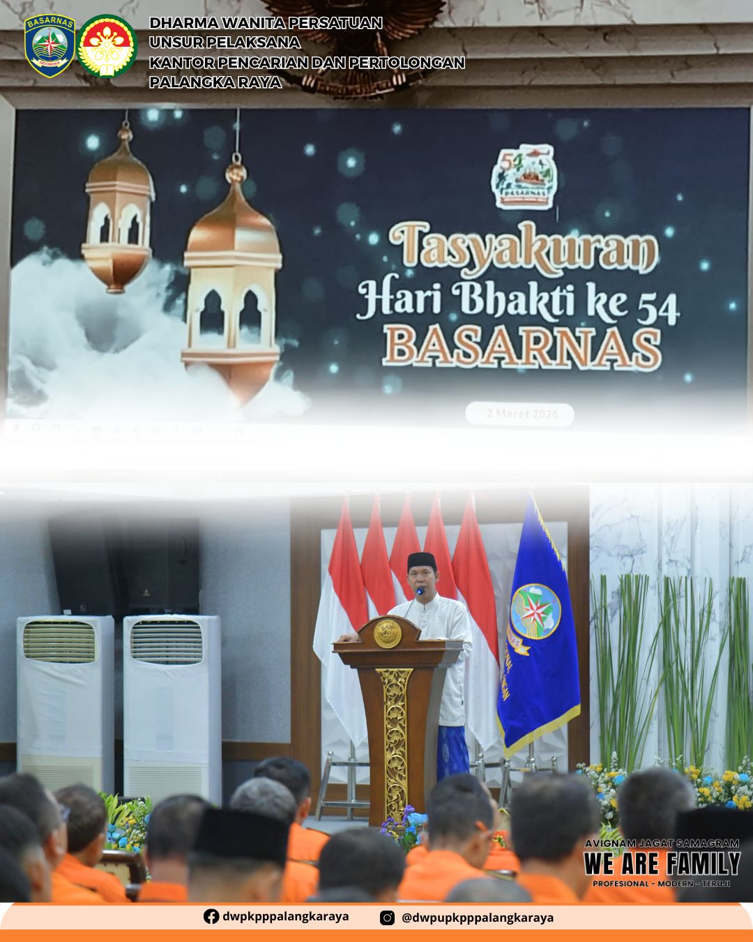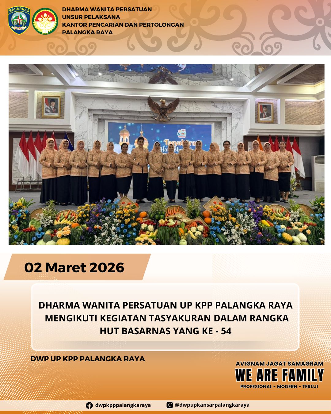 Pada tanggal 02 Maret 2026, Ketua DWP Palangka Raya Ny. Anak Agung Konik Alit Supartana mengikuti kegiatan Tasyakuran Memperingati HUT Ke - 54 Basarnas bertempat di Jakarta dan anggota bertempat di Kantor Pencarian dan Pertolongan PalangkaRaya, diikuti 10 orang anggota.