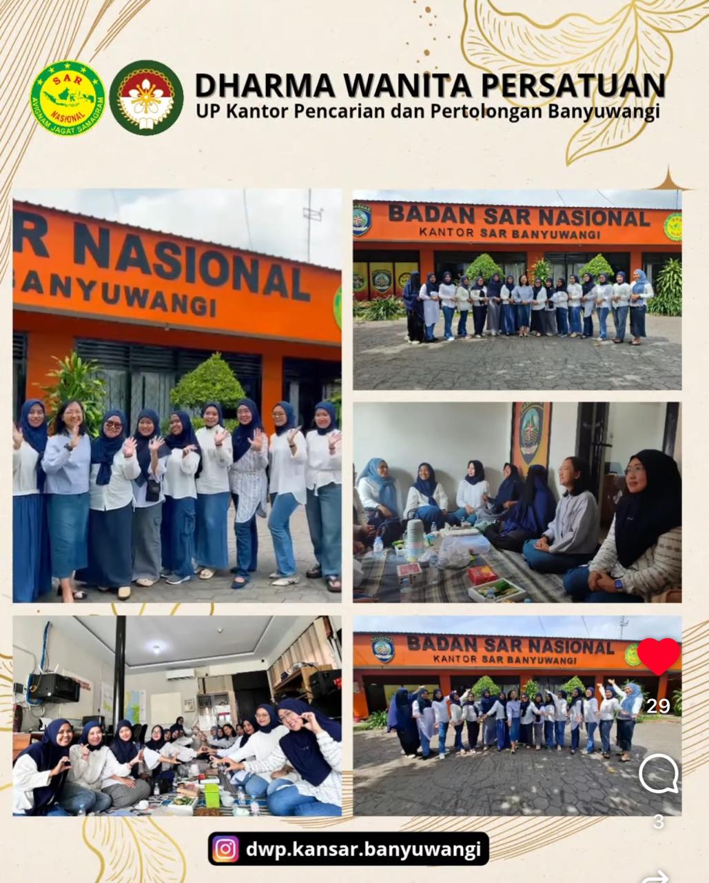Hari Minggu, tanggal 28 Desember 2025, bertempat di Kantor SAR Banyuwangi, melaksanakan Pertemuan Rutin Bulanan periode bulan Desember 2025, yang diikuti oleh anggota DWP UP sebanyak 16 orang, sekaligus ramah tamah dan perkenalan antara Ibu Ketua DWP UP Kansar Banyuwangi dengan anggota DWP UP
