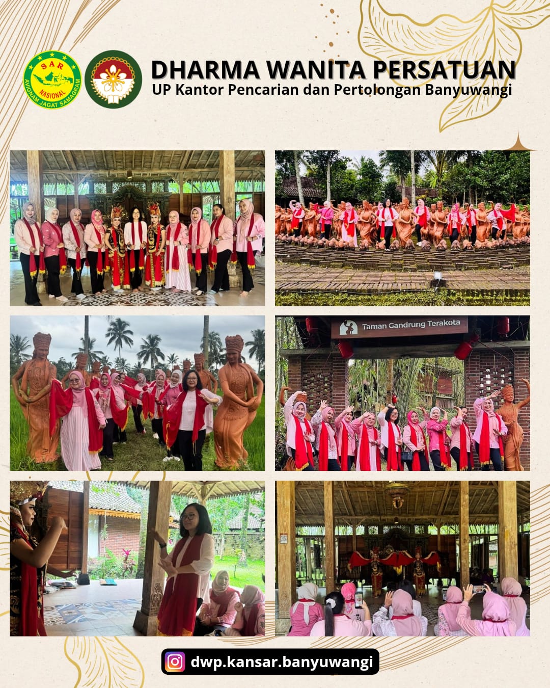 Hari Selasa, tanggal 24 Maret 2026, dalam rangka mendukung program kerja bidang Sosial Budaya tahun 2026 sebanyak sembilan orang anggota Dharma Wanita Persatuan Unsur Pelaksana Kantor Pencarian dan Pertolongan Banyuwangi turut berpartisipasi dalam mempromosikan wisata lokal dengan mengunjungi Taman Gandrung Terakota yang berlokasi di Krajan, Tamansari, Kecamatan Licin, Kabupaten Banyuwangi, Jawa Timur. Kegiatan ini bertujuan untuk mengenalkan lebih dalam kekayaan sejarah dan budaya Banyuwangi kepada seluruh anggota DWP, sekaligus mendorong masyarakat luas untuk lebih mencintai dan melestarikan destinasi wisata daerah. Taman Gandrung Terakota sendiri merupakan ikon budaya yang menampilkan seribu patung penari gandrung, sebagai simbol kesenian khas Banyuwangi yang sarat nilai historis dan filosofi. Dalam kegiatan tersebut, para anggota DWP mendapatkan edukasi mengenai sejarah lahirnya Tari Gandrung yang menjadi identitas masyarakat Banyuwangi, serta makna dibalik setiap elemen yang ditampilkan di kawasan wisata Taman Gandrung Terakota tersebut. Kegiatan ini tidak hanya menjadi ajang silaturahmi, tetapi juga sebagai bentuk dukungan nyata terhadap pengembangan pariwisata lokal. Dengan adanya kegiatan ini pula, diharapkan anggota DWP UP dapat menjadi agen promosi yang turut mengenalkan potensi wisata Banyuwangi kepada masyarakat luas dan meningkatkan kesadaran akan pentingnya pelestarian budaya serta pengembangan pariwisata lokal semakin meningkat, sehingga mampu memberikan dampak positif bagi kemajuan daerah Banyuwangi.