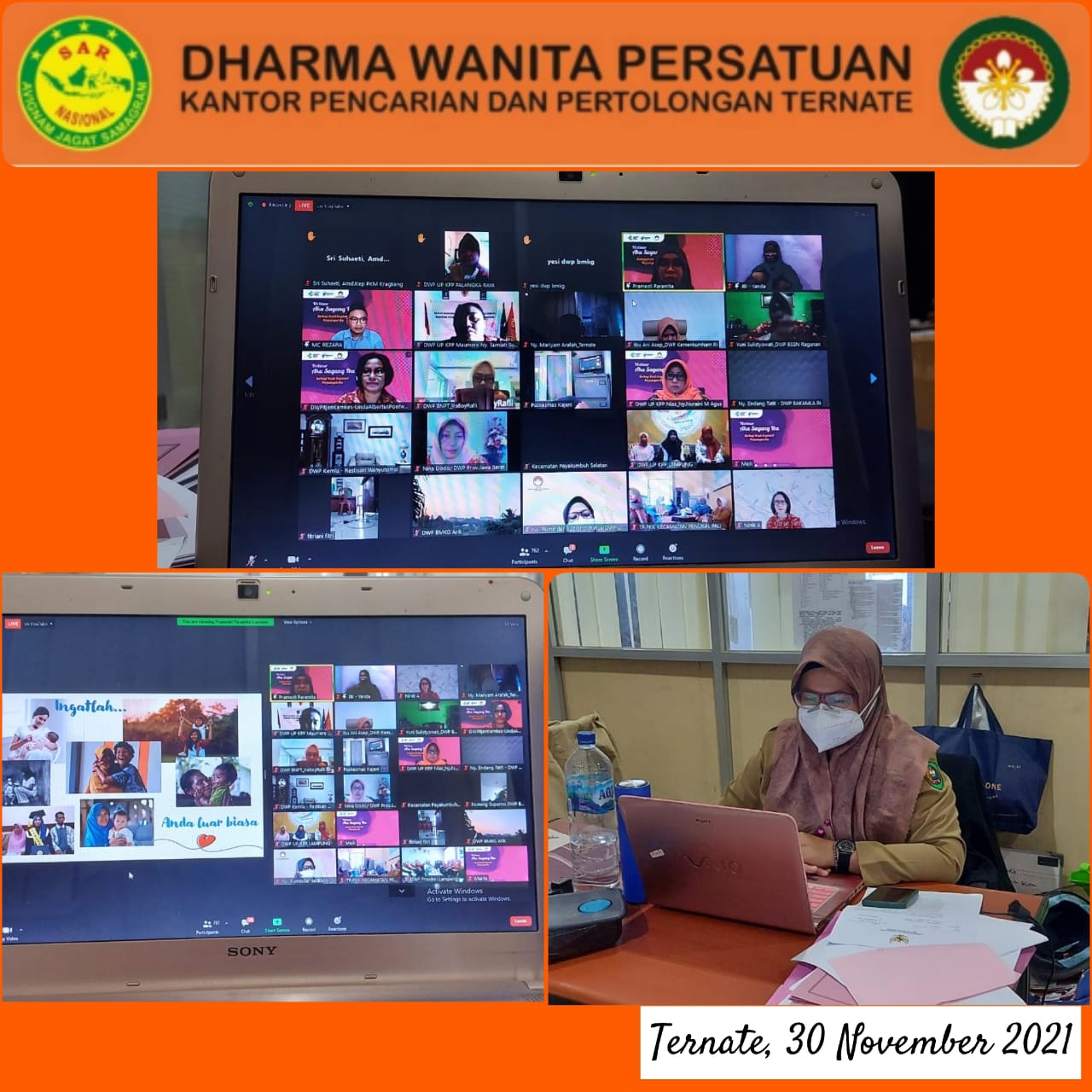 Tanggal 30 November 2021 DWP UP. Kantor Pencarian dan Pertolongan Ternate mengikuti Kegiatan Webinar Kelas Ibu Balita Bulan November secara virtual dengan Materi "Kisah Inspiratif Perjuangan Ibu dalam Merawat Anak dengan Disabilitas & Bagaimana Ibu Menjadi Sosok Istimewa Bagi Anaknya". Kegiatan ini diselenggarakan oleh Kementerian Kesehatan Dalam rangka meningkatkan Pengetahuan Kesehatan Ibu dan Anak pada Ibu Hamil dan Ibu Balita untuk Anggota Dharma Wanita dan Pegawai di Lingkungan Kementerian/Lembaga dengan Metode Daring.