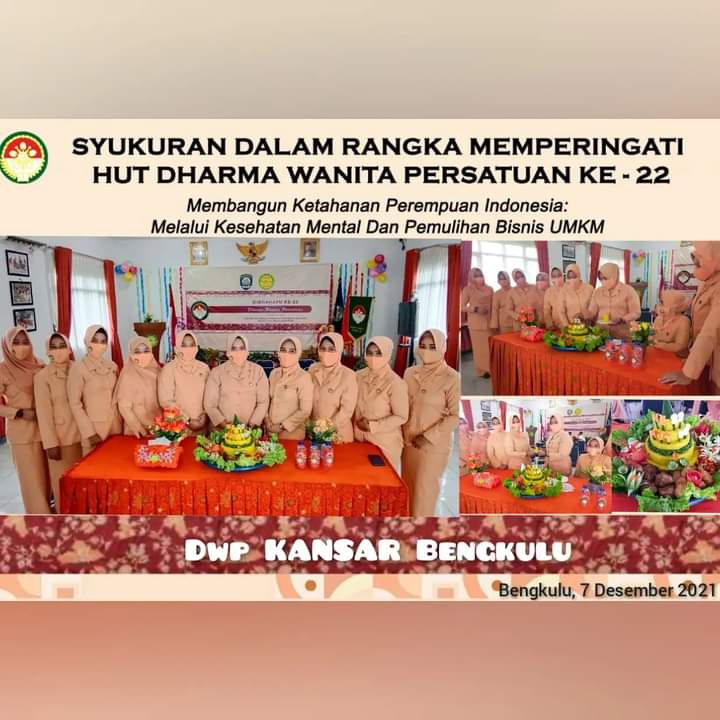 Giat DWP UP KPP Bengkulu Selasa, 07 Desember 2021 Syukuran dalam rangka memperingati HUT DHARMA WANITA PERSATUAN KE 22 Secara Virtual dengan jajaran DWP BASARNAS. "Membangun Ketahanan Perempuan Indonesia : Melalui Kesehatan Mental dan Pemulihan Bisnis UMKM" Agenda Dwp KanSAR Bengkulu 1. Mengikuti syukuran secara virtual 2. Potong tumpeng 3. Makan Bersama 4. Doorprize