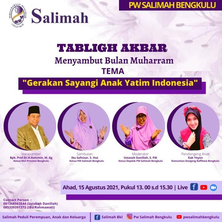 Giat Dwp Kansar Bengkulu, Minggu, 15 Agustus 2021, pukul 13.00 s/d 15.30 WIB. Mengikuti Tabligh Akbar Menyambut Bulan Muharram bersama PW. Salimah Bengkulu via online ( live zoom ). Dengan tema "Mari sayangi anak yatim Indonesia" Nara sumber : Bpk. Prof. DR. H. Rohimin M.Ag. ( Ketua MUI Propinsi Bengkulu )