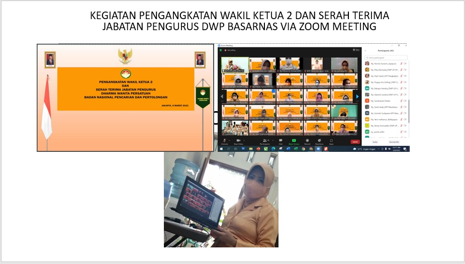Pada tanggal 8 Maret 2022 Ketua DWP UP KPP Surabaya menghadiri acara Pengangkatan Wakil Ketua 2 dan Serah Terima Jabatan Pengurus DWP Basarnas melalui aplikasi zoom meeting.