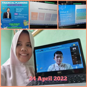Minggu, 24 April 2022. Ketua Dharma Wanita Persatuan Unsur Pelaksana Kantor Pencarian dan Pertolongan Jakarta mengikuti webinar finansial dengan tema ",Finansial Planning for Milenials" bersama Banu Muhammad, S.E,M.SE