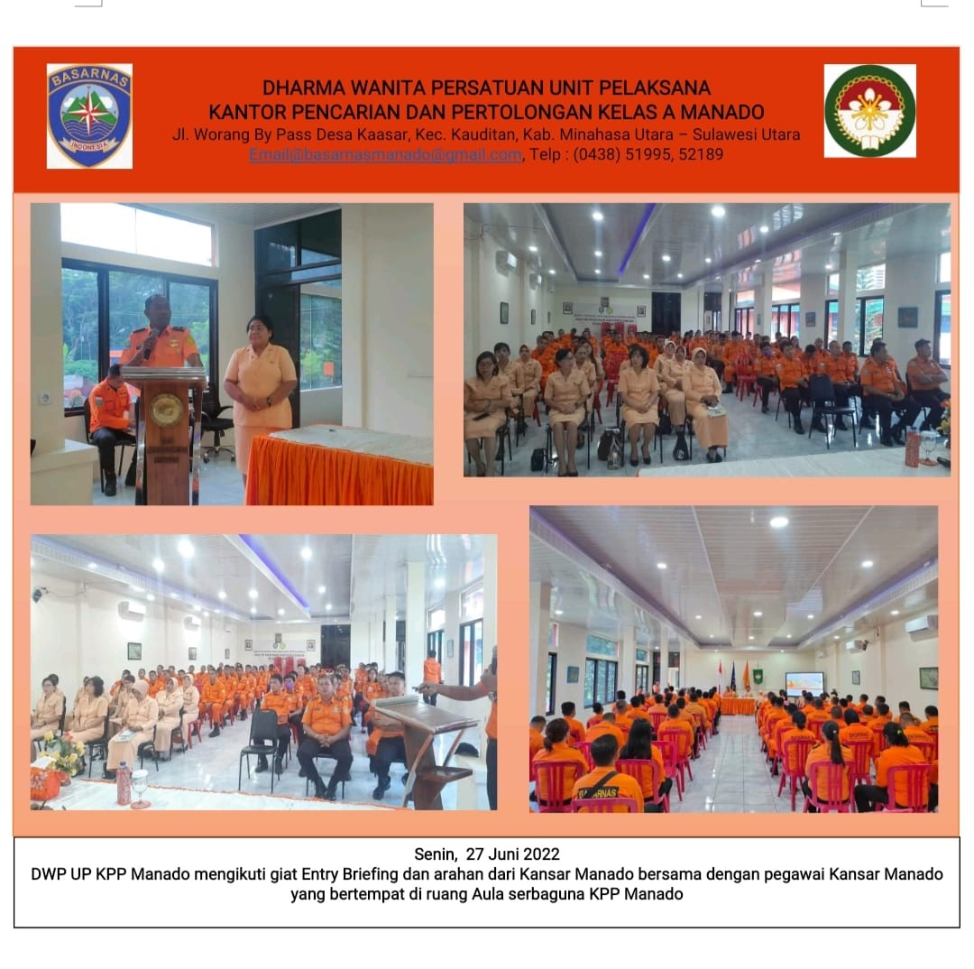 Pada tanggal 27 Juni 2022, DWP UP KPP Manado mengikuti Entry Briefing dan arahan dari Kansar Manado bersama dengan Pegawai Kansar Manado yang bertempat di ruang Aula serbaguna KPP Manado dan diikuti oleh 12 orang anggota