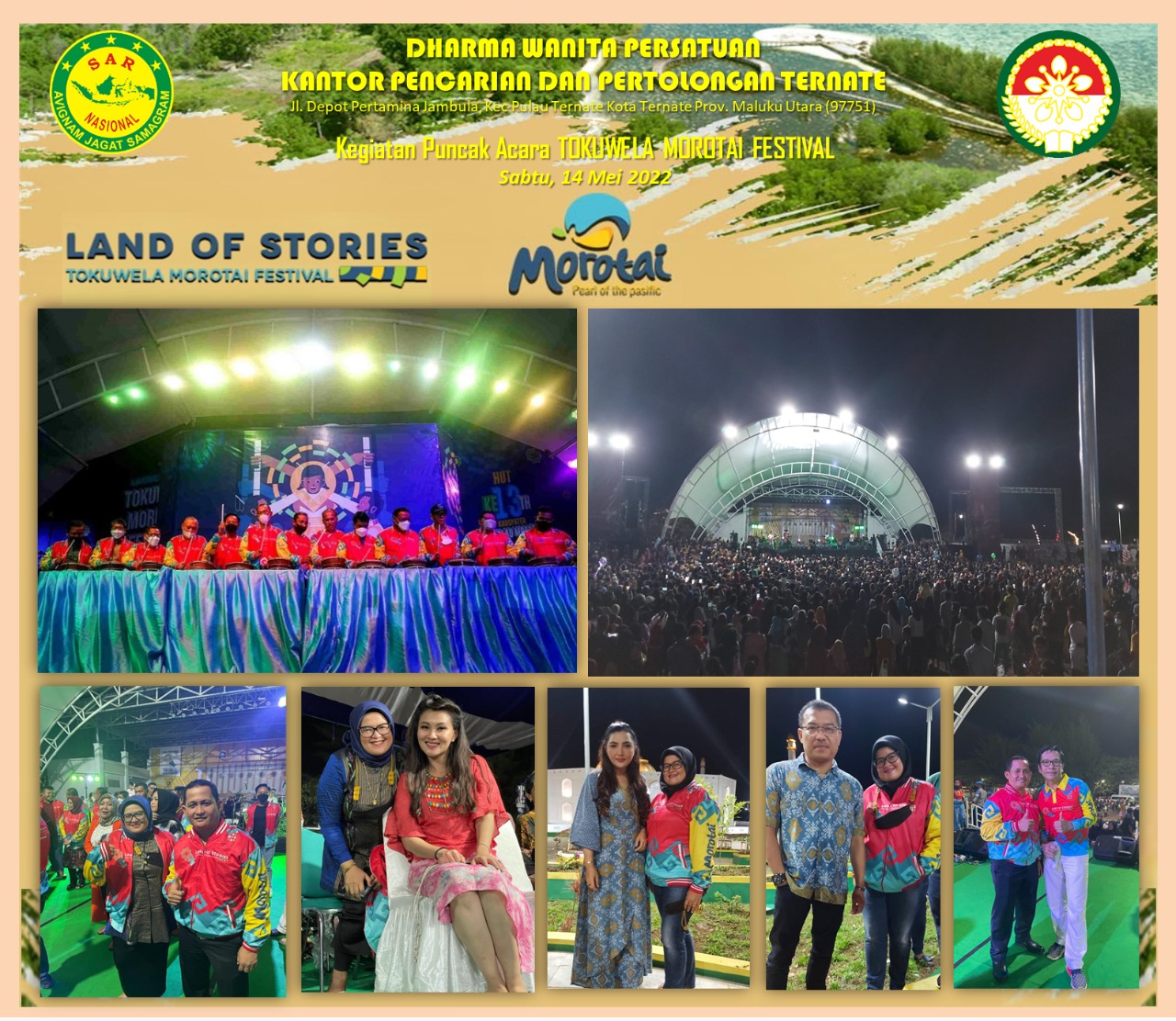 Sabtu,14 Mei 2022 Ketua DWP Kantor Pencarian dan Pertolongan Ternate Mandampingi Kepala Kantor Pencarian dan Pertolongan Ternate menghadiri undangan Bupati Kepulauan Morotai pada kegiatan Puncak Acara TOKUWELA MOROTAI FESTIVAL.
