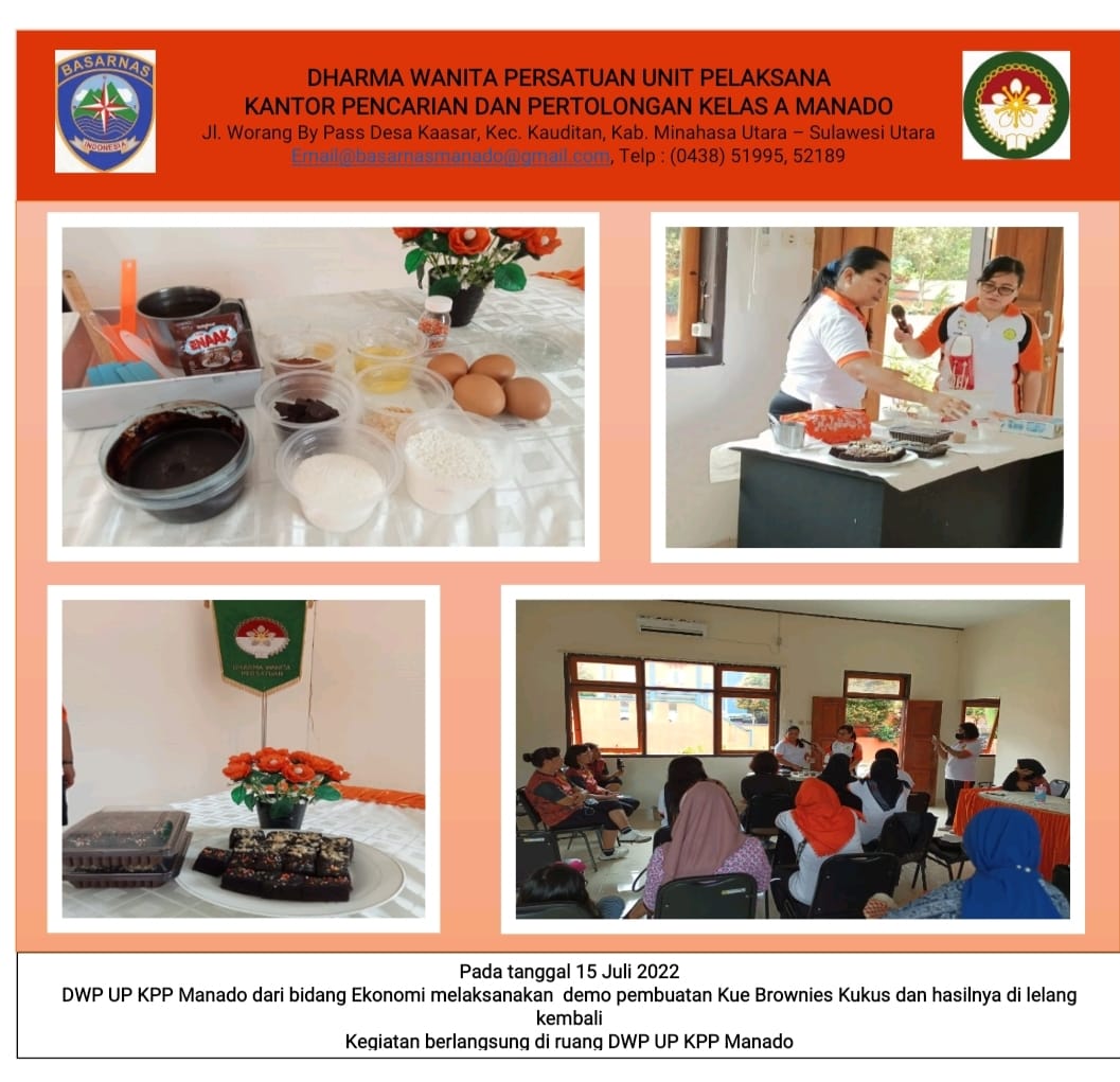 Pada tanggal 15 Juli 2022 DWP UP KPP Manado dari bidang Ekonomi melaksanakan demo pembuatan Kue Brownies Kukus dan hasilnya di lelang kembali Kegiatan berlangsung di ruang DWP UP KPP Manado