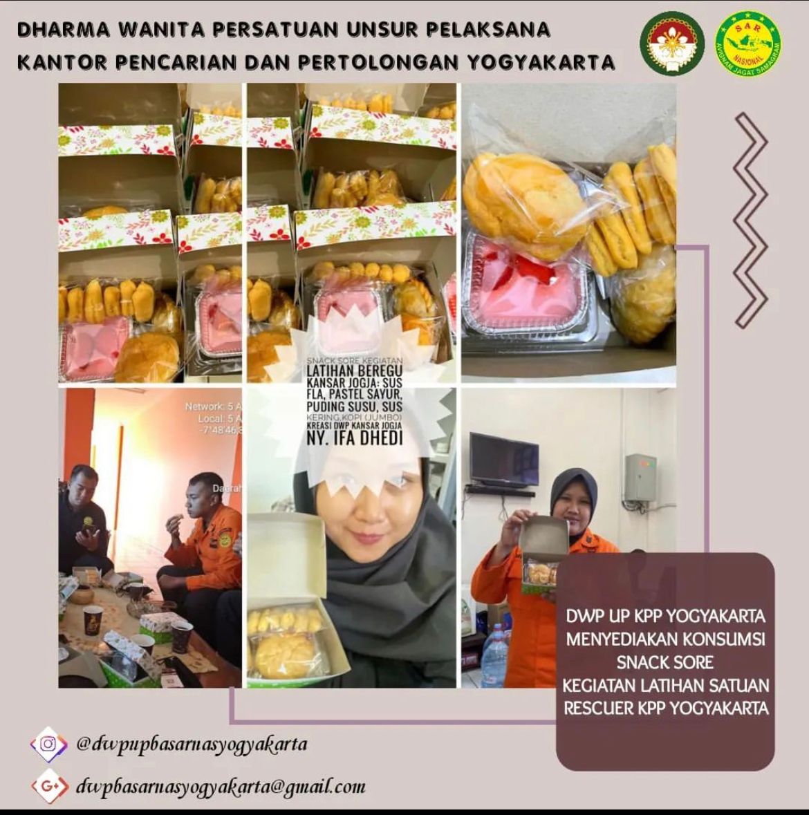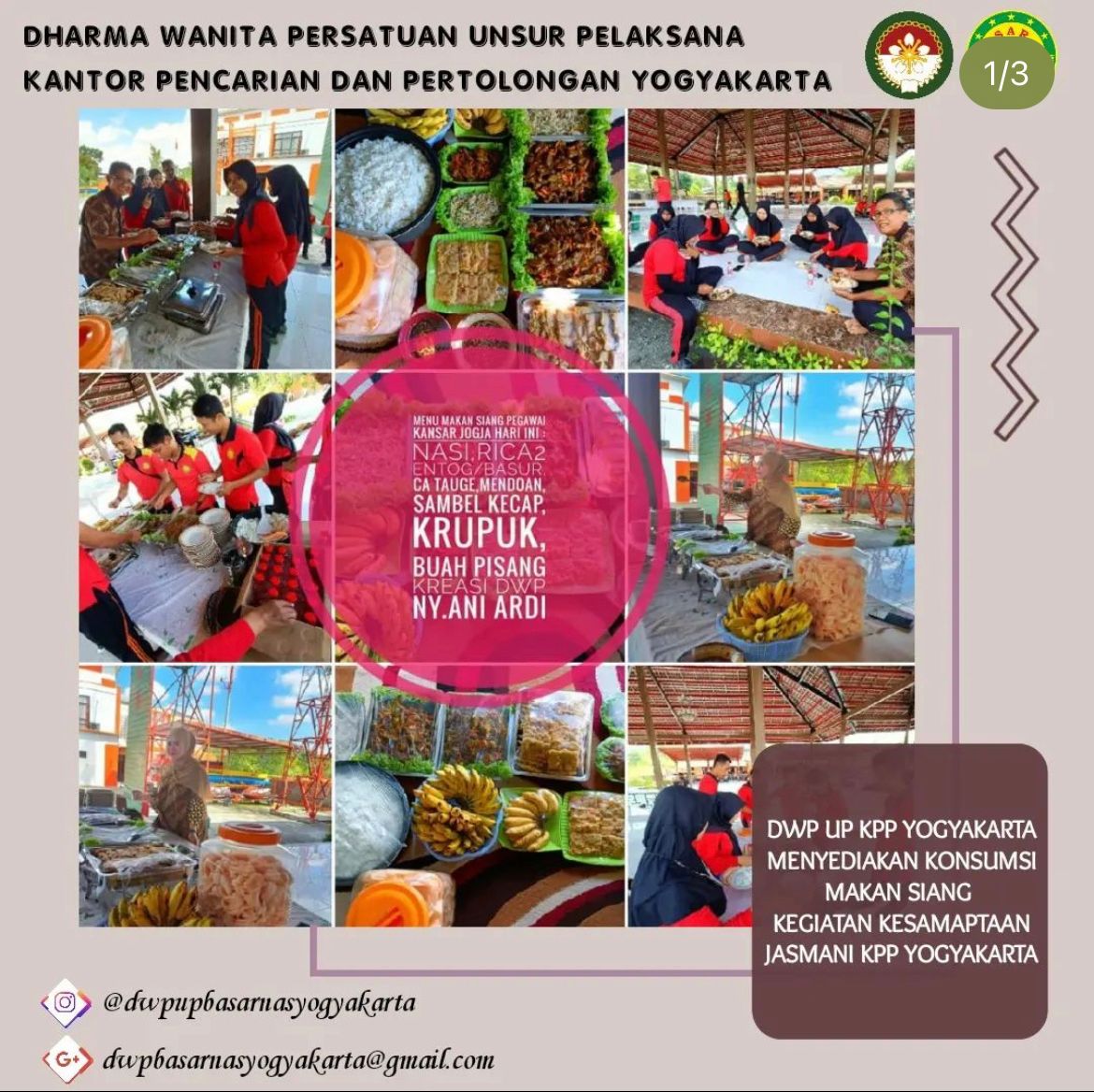 DWP Up Kantor Pencarian dan Pertolongan Yogyakarta Ny. Ani Ardi Menyediakan Konsumsi , 50 Porsi Makan Siang Kesemaptaan bagi Pegawai KPP Yogyakarta dan Ny. Ifa Dhedi Menyediakan Konsumsi Makan Siang dan Snack Sore 20 Porsi Untuk Kegiatan latihan Satuan Rescuer Kantor Pencarian dan Pertolongan Yogyakarta