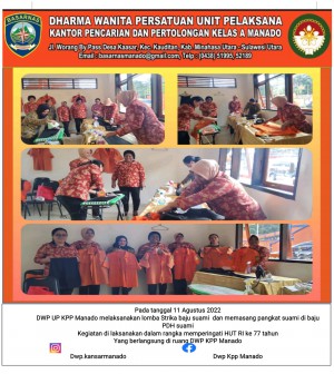 Pada tanggal 11 Agustus 2022 DWP UP KPP Manado melaksanakan lomba Strika baju suami dan memasang pangkat suami di baju PDH suami Kegiatan di laksanakan dalam rangka memperingati HUT RI ke 77 tahun Yang berlangsung di ruang DWP KPP Manado