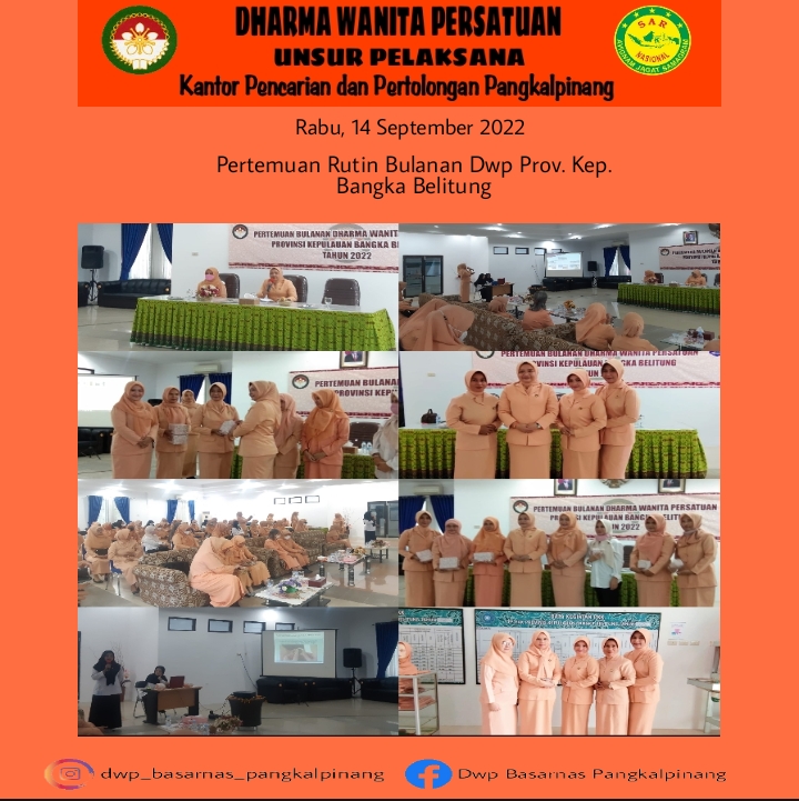 Rabu, 14 September 2022 Wakil Ketua Dwp Up Kantor Pencarian dan Pertolongan Pangkalpinang beserta anggota menghadiri pertemuan rutin bulanan Dwp. prov. Kepulauan Bangka Belitung yang diisi dengan kegiatan arisan dan Sosialisasi Deteksi Dini Terlambat Bicara oleh Ibu Ety Mujiawati, A.Md.,TW.SPd