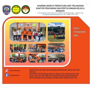 Kamis, 29 September 2022 Kepala Kantor pencarian dan pertolongan Manado Bpk. Monce Brury S.IP bersama Ketua DWP UP KPP Manado Ny. Lince Monce Brury menerima Guru dan Siswa /siswi dari SMA UNKLAP Airmadidi Manado yang berkunjung Ke Kantor pencarian dan pertolongan Manado dalam Rangka Study Tour