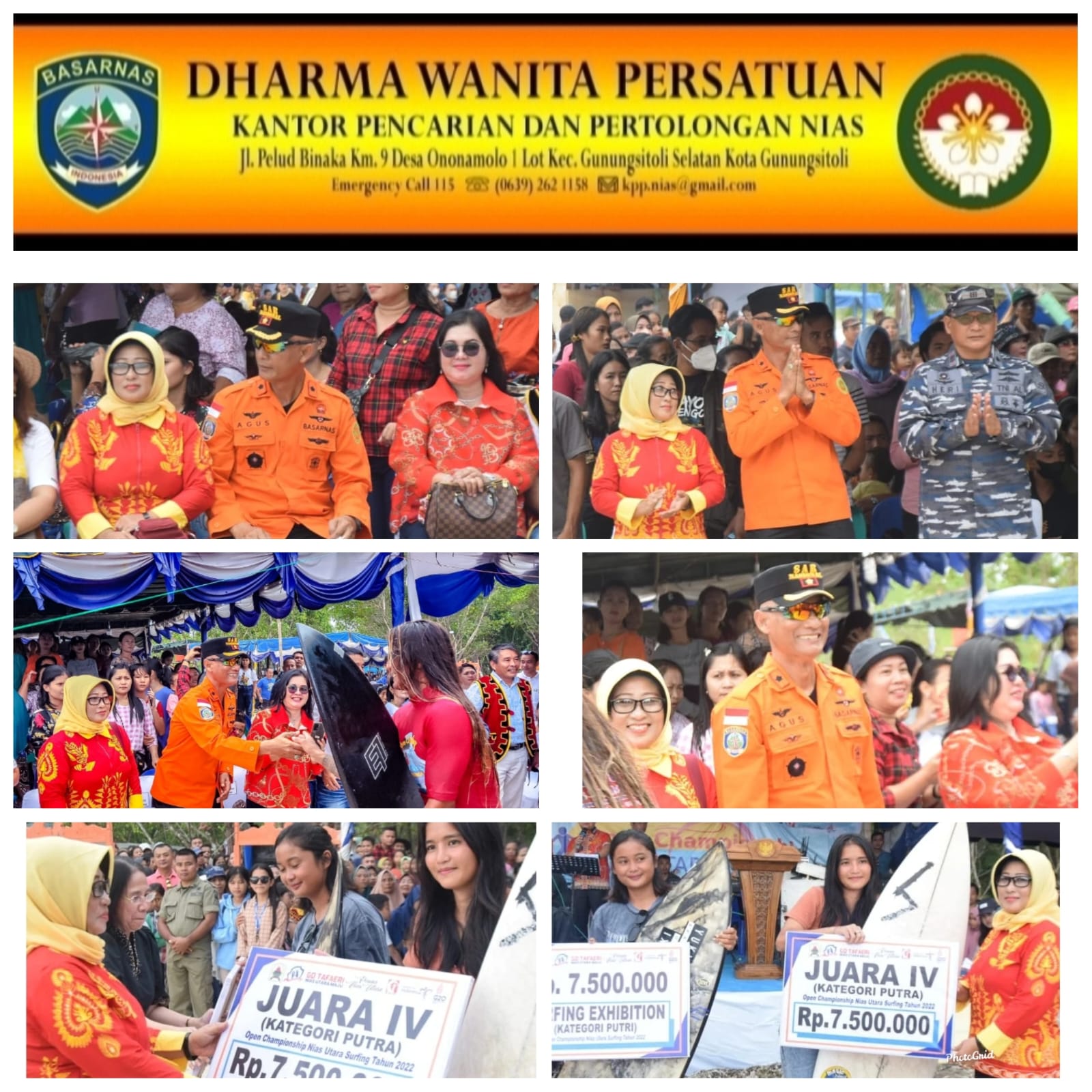 Sabtu 8 Oktober 2022, Kepala Basarnas NIAS beserta Ibu DWP menghadiri acara penutupan kegiatan Championship Nias Utara Surfing di pantai Turedawola Kec. Afulu.