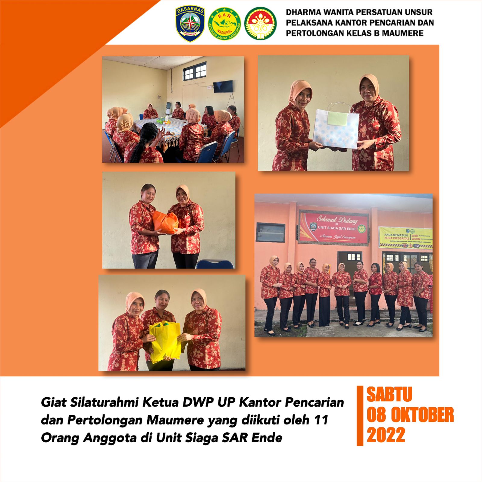 Sabtu, 8 Oktober 2022. Giat Silaturahmi Ketua DWP UP Kantor Pencarian dan Pertolongan Maumere (Ny. Yuli Efendi) yang diikuti oleh 11 Orang Anggota di Unit Siaga SAR Ende
